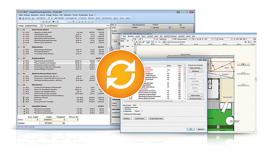 Nach der Aufnahme oder der Absteckung der Punkte wird der Plan als DXF-Datei importiert und ins Büro transferiert. Dort werden die Aufmaßdaten per CAD-Programm weiterverarbeitet (z. B. ISL-Kocher oder Vectorworks). Das CAD-System erzeugt automatisch eine bemaßte und REB-konforme Volumenberechnung mit zeichnerischem Nachweis (»Massenzerlegung«). Anschließend werden die REB-konformen Daten in die Software GaLaOffice 360° von KS21 Software und Beratung aus Sankt Augustin importiert. Per Knopfdruck wird die Massenzerlegung aus dem CAD-System für den rechnerischen Nachweis übergeben. So bleibt die Abrechnung vollständig nachvollziehbar und prüfbar. Auf Wunsch bzw. je nach Projektstatus können die Daten für Angebotskalkulationen und zu Abrechnungszwecken verwendet werden. §