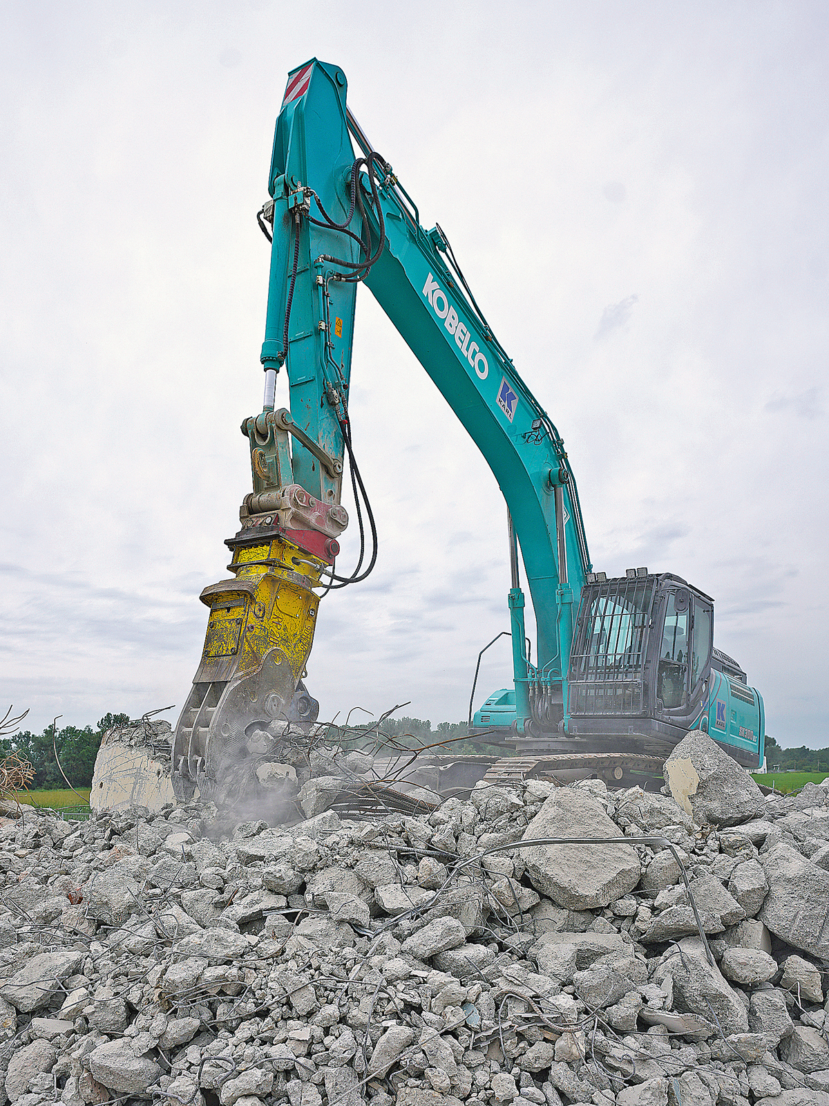 »Wir sparen Zeit und Kosten«, kommentiert Polier Daniel Sellner den hohen Aufwand mit den Kobelco-Großmaschinen, die aufgrund langjährig erfahrener Baggerführer auch auf engstem Raum im effizienten Doppelangriff arbeiten. Die unmittelbare Verarbeitung der bis zu mehreren Tonnen schweren Stahlbeton-Trümmer ohne Zwischentransport entzerrte zudem die Baustellen-Logistik – je nach Standort übernahm ein Großradlader den Transport des auf max. 600 mm vorzerkleinerten Betonbruchs zum 300 t/h-Mobilbrecher, der im Zuge des Projekts rund 80 000 t Frostschutz-Ersatzmaterialien direkt auf der Baustelle produzierte. Die Stahl- und Metallanteile wurden nach Größe und Material direkt in bereitstehende Container sortiert, was das weitere Handling und damit die Wertschöpfung von Altmetallen optimierte.