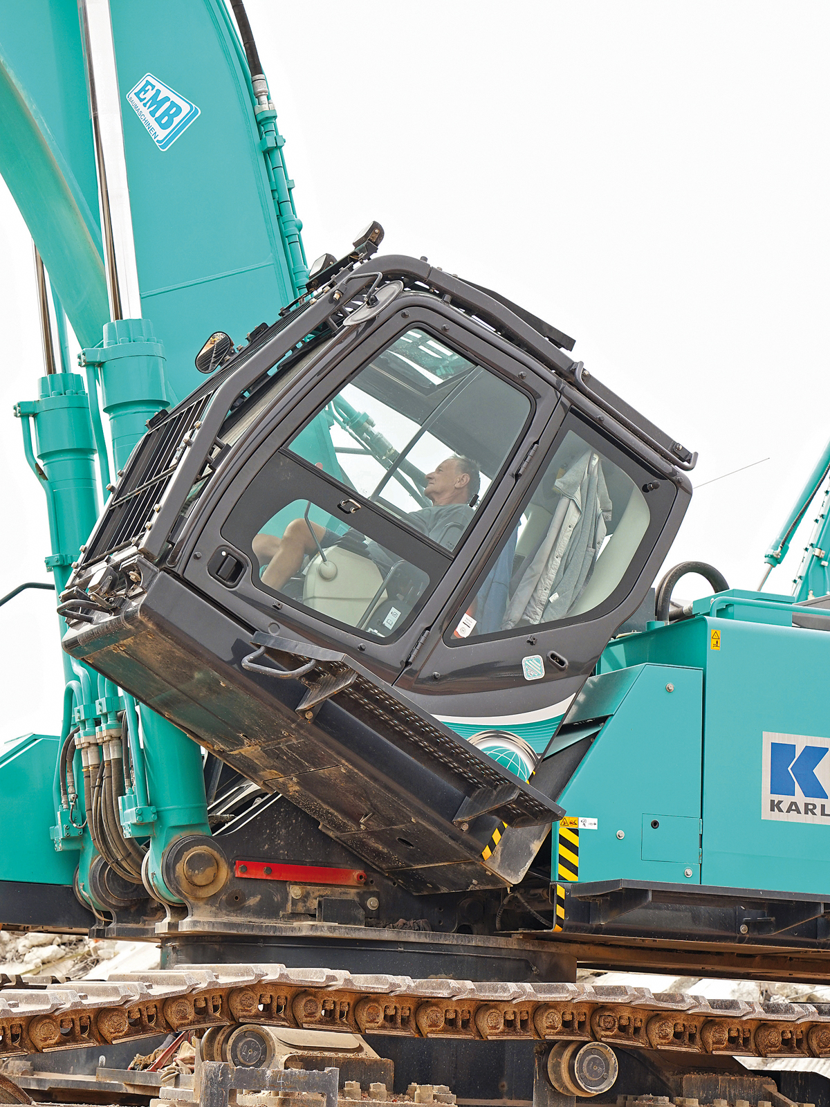 Das EMB-»Customizing« an den beiden Kobelco »SK850LC« von Karl umfasste neben dem Einbau von zusätzlichen Druckwaagen in der Arbeitshydraulik und der Ausrüstung mit einem Onboard-Kompressor insbesondere die fahrerfreundliche Kippfunktion der Originalkabine. Damit spielen die beiden 85-Tonner nicht nur im schweren Erdbau mit 5-m³-Tieflöffel ihre Standfestigkeit sowie großen Hub- und Losbrechkräfte aus, sondern überzeugen auch im Primärabbruch mit leistungsstarken Abbruchscheren und Zerkleinerern. Wie beim kleineren Kobelco »SK500LC« ermöglichen hohe Anbaugewichte und große Leistungsreserven der Arbeitshydraulik nicht nur den flexiblen Einsatz schwerer Werkzeuge am Schnellwechsler – in Seebach sind es auch Abbruchscheren und Pulverisierer zwischen 5 t und 6 t Eigengewicht sowie Schrottscheren bis 8 t. Die leistungsoptimierte Auslegung von Motoren und Arbeitshydraulik auf Kawasaki-Basis deckt selbst große Leistungsspitzen ab, während die Baggersteuerungen mit drei Grundeinstellungen (H/S/Eco) und bis zu 20 frei konfigurierbaren Programmen für unterschiedlichste Anbauten ein gleichermaßen feinfühliges wie schnelles und vor allem wirtschaftliches Arbeiten ermöglichen. So lässt sich zum Beispiel der Hydraulikdruck beim Öffnen der Betonschere gezielt reduzieren – die nicht benötigte Leistung steht unmittelbar den anderen Kreisläufen für schnelles Heben oder Schwenken zur Verfügung.