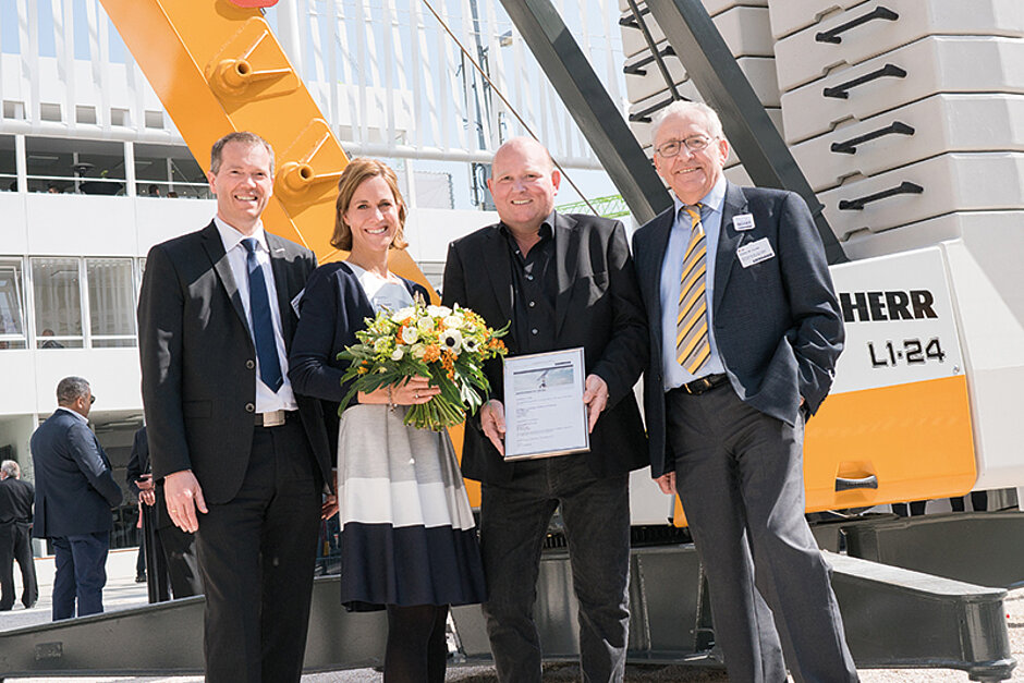 Unverhofft kommt oft – die Freude stand Gerald Hoppmann ins Gesicht geschrieben, als ihn Stéfanie Wohlfarth sowie Dominique Tasch (Geschäftsführer der Liebherr-Werk Biberach GmbH) zu seinem Gewinn beglückwünschten. »Ich freue mich riesig über den L1-24. Das passte ganz genau, denn ich wollte sowieso einen neuen Liebherr-Kran kaufen«, so Hoppmann. Er führt die Hoppmann Bau GmbH & Co. KG in Metjendorf-Wiefelstede bei Oldenburg mit knapp 30 Beschäftigten in der zweiten Generation. Schon sein Vater, der die Firma im Jahr 1969 gründete, war Liebherr-Kunde bei Händler MARM in Delmenhorst. Neben seinen beiden eigenen 22-HM-Liebherr-Kranen hat Gerald Hoppmann häufig weitere Mietgeräte im Einsatz. »Der L1 scheint ideal zu sein für unsere Baustellen. Wenn er sich in der Praxis bewährt, kaufe ich womöglich noch einen«, sagt Hoppmann. Das Bauunternehmen ist auf Einkaufszentren und Verwaltungsgebäude spezialisiert.
