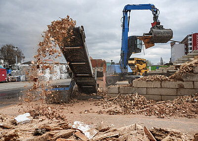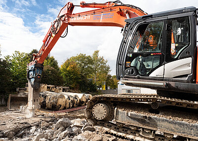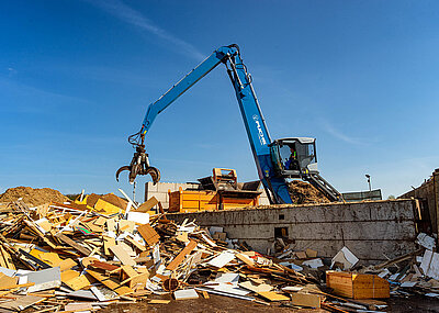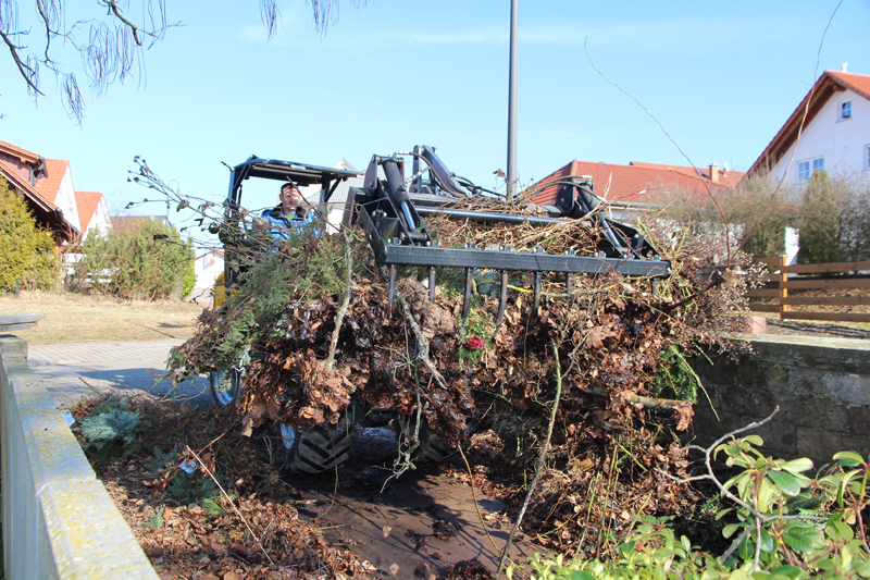 Mit der Pelikanschaufel schafft Halfmann zügig den anfallenden Grünschnitt weg, egal, ob auf dem Friedhof nach Pflegearbeiten oder nach Fällungen von Bäumen und Gebüsch. Wenn die Liegezeiten abgelaufen sind, entfernt Halfmann auch ganze Gräber und bereitet die Bereiche für neue Bestattungen vor. Zuerst werden alte Grabsteine mit dem Greifer entfernt, dann auch die Fundamente entfernt und das Gelände eingeebnet – bei all diesen Tätigkeiten spielt der Giant eine entscheidende Rolle.