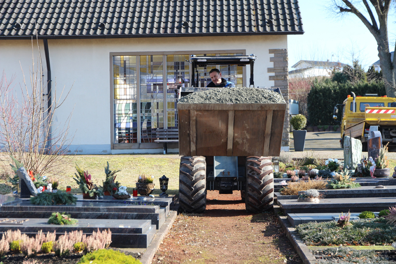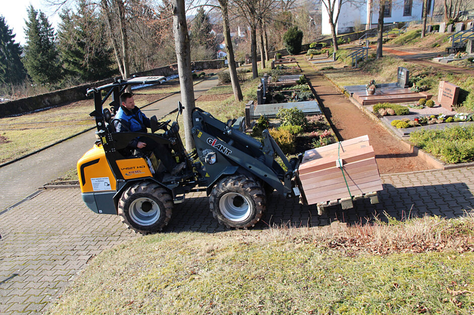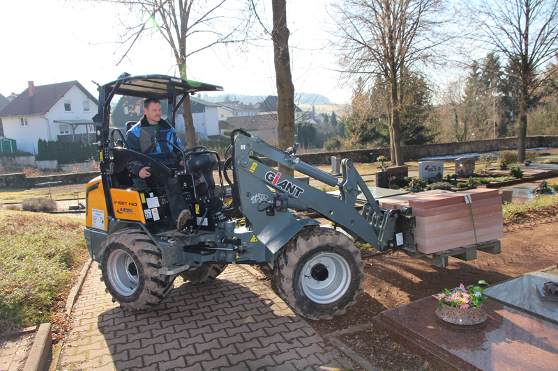 Beim Ortstermin in Heiligenmoschel demonstriert Halfmann, wie er mit seinen verschiedenen Anbaugeräten die anfallenden Arbeiten auf dem Friedhof erledigt: Wenn er neue Felder einfassen muss, transportiert er mit Hilfe der Palettengabel die Steinplatten über die schmalen Wege des Friedhofs bis zum zu dem Grabfeld, wo sie gebraucht werden. Das Gleiche wird mit der 700 Liter fassenden Schaufel praktiziert, wenn beispielsweise Mutterboden zu den Gräbern oder Beetanlagen zu bringen ist. Halfmann zeigt, wie sicher sich der Giant um die engen Kurven steuern lässt, auch mit der Beladung mit größeren Lasten bleibt der Radlader leicht und sicher steuerbar.