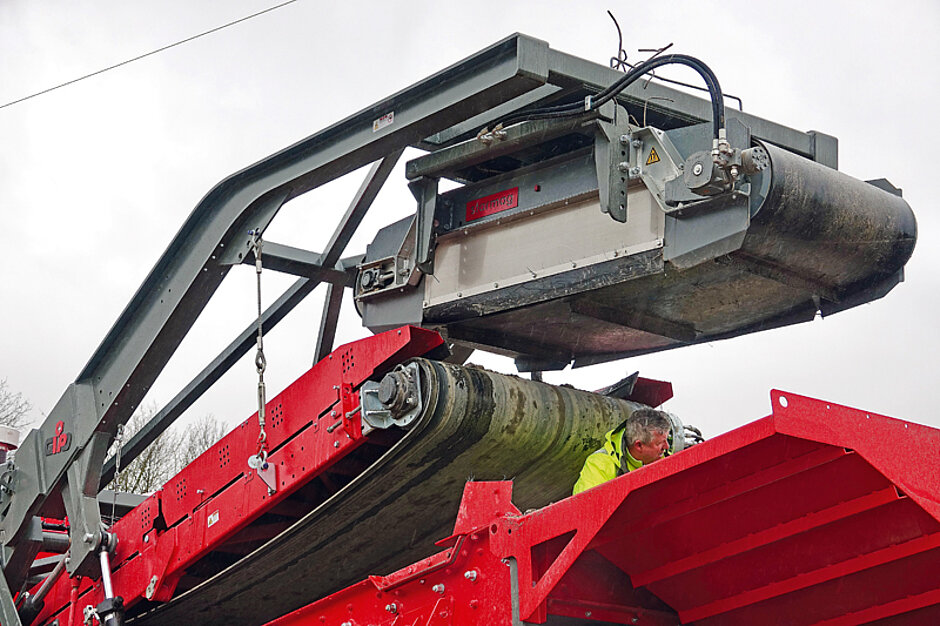 Bestandteil der Kombianlage ist eine aktive Vorsiebeinheit, die das Aufgabematerial von Feinanteilen trennt, die Zerkleinerung erfolgt in einem 1 300 mm breiten Prallbrecherrotor. Über dem Hauptförderband hängt ein in Längsrichtung montierter Magnetabscheider, der den Materialfluss von eisenhaltigen Teilen befreit. Das soll die Lebensdauer des Förderers erhöhen und wartungsbedingte Standzeiten reduzieren. Das Zwischenprodukt gelangt in die mit 5,5 m x 1,8 m dimensionierte Doppeldeckernachsiebeinheit.
