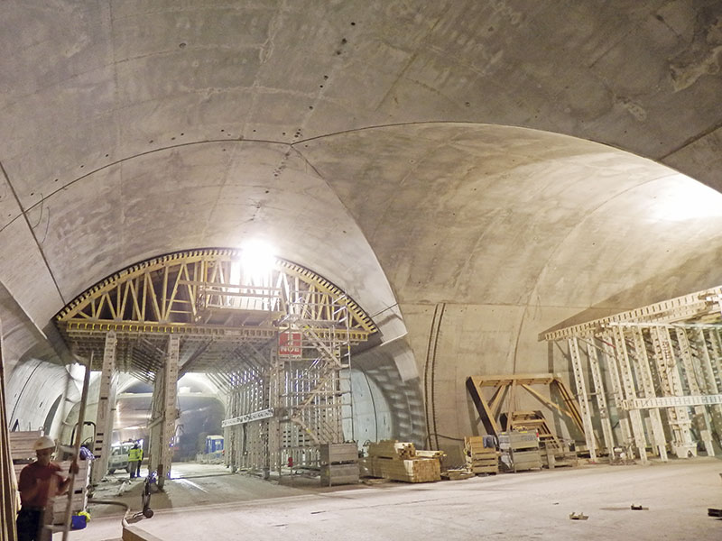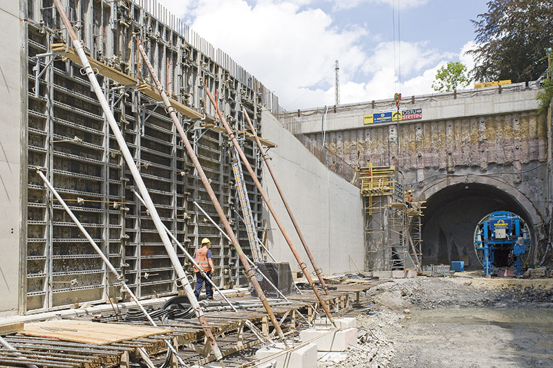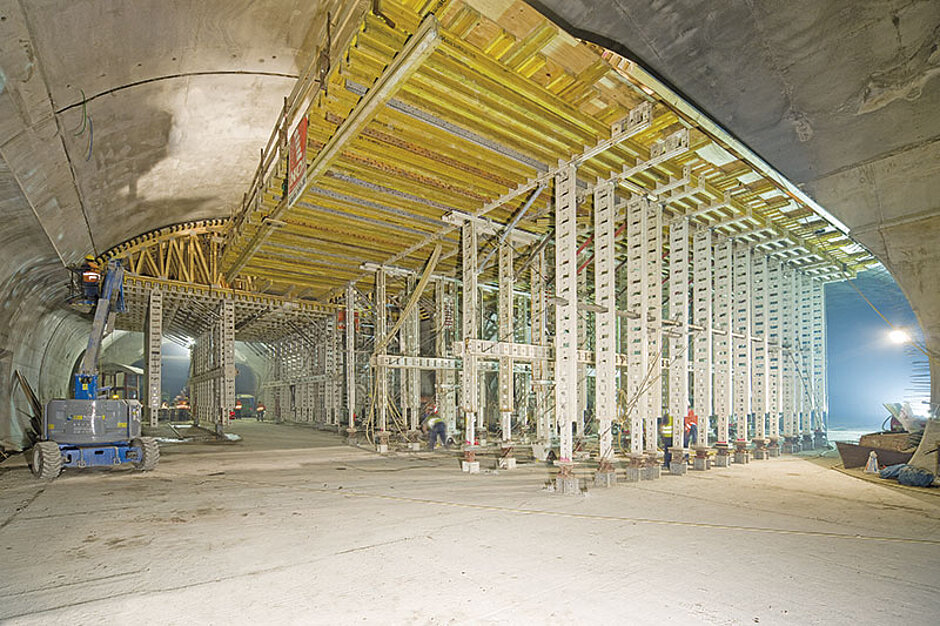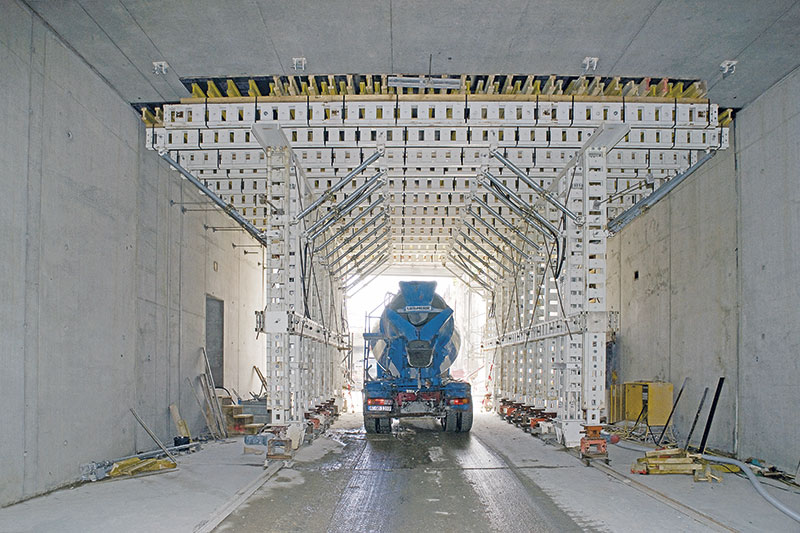 Beim Bau des Gmünder Einhorn-Tunnels kamen mehrere Noetec-Schalwagen als Deckenschalwagen zum Einsatz. Die Noetec-Systemschalung lässt sich am ehesten mit einem Modellbaukasten vergleichen. Darüber hinaus besteht sie aus einer übersichtlichen Anzahl von Einzelelementen, die individuell kombiniert werden können. Der Aufbau ist einfach und fast selbsterklärend. Dadurch lässt sich die Schalung in kürzester Zeit exakt auf die jeweiligen Anforderungen des Projekts maßschneidern. Dies macht das System zu einem Alleskönner, der sich für jede Ingenieur-Baustelle eignet. Dabei bietet Noetec ein hohes Maß an Arbeitssicherheit und zeichnet sich durch eine hohe Tragfähigkeit aus. Mit Noetec lassen sich nicht nur Gewölbe- und Tunnelschalungen projektieren, auch Wand- oder Kletterschalungen sind mühelos möglich. Ein besonderes Beispiel für die Flexibilität der Noetec ist ihr Einsatz als selbstfahrende Schalwagen beim Gmünder Einhorn-Tunnel.Selbstfahrende Schalwagen