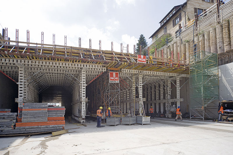 Zur Ortsumgehung Schwäbisch Gmünd gehörten zwei in offener Bauweise errichtete Tunnelabschnitte (West ca. 228 m und Ost ca. 315 m lang). Eine 1 m dicke Betonwand unterteilt sie teilweise in zwei Röhren. Diese Betonwand trägt gemeinsam mit den beiden Außenwänden die 2,2 m dicke Tunneldecke. Für die Errichtung des Bauwerks kamen rund 12 m lange Schalwagen zum Einsatz. Sie bestanden aus Elementen des Noetec-Systems, wodurch sie sich sehr schnell und effizient montieren ließen, dies ist gerade bei Tunnel-Baustellen von besonderem Vorteil ist. Die Noetec-Konstruktionen haben ein Gewicht von je 40 t und stehen auf Schienen. Auf diesen wurden die Wagen mithilfe von Elektroantrieben von einem Betonierabschnitt zum nächsten verfahren. Damit sich die Schalung nach dem Aushärten des Betons einwandfrei löst, befindet sich der Schaltisch auf hydraulischen Stempeln, die sich um bis zu 50 cm absenken.Ein großer Vorzug der Schalwagen, die mit Noetec erstellt wurden, besteht in ihrer Wandelbarkeit. Normalerweise beträgt die Breite der Röhren 9,5 m. In einem kleinen Abschnitt jedoch ist eine der beiden Röhren breiter. Dank Baukastensystem konnten die Verantwortlichen den Schalwagen diesem Versprung mühelos anpassen. Sie mussten lediglich ein entsprechendes Bauelement davor befestigen. Darüber hinaus kamen Noetec-Schalwagen im Bereich der Pannenbuchten, Elektro- und Lüfterstollen zum Einsatz.