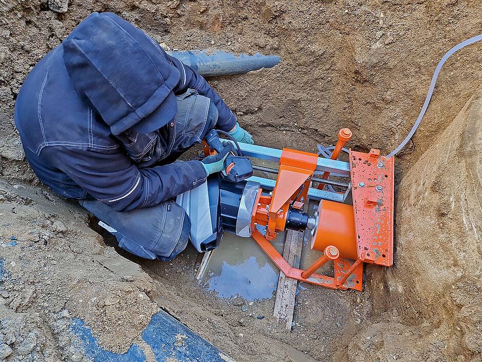 Der Antrieb erfolgt über das Stihl-»AP«-Akkusystem, wodurch sich laut Gölz sinnvolle Synergien mit weiteren Geräten auf der Baustelle ergeben. Der Bohrbereich von 110 bis 290 mm, ein robuster Bohrständer mit 600 mm Hub und ein 10-l-Druckwasserbehälter sorgen laut Herstellerangaben für eine effiziente und saubere Bohrleistung. Die Fixierung erfolgt stabil über einen Bodenrahmen mit Kranöse sowie Spannband und Erdnägel zur sicheren Befestigung an frei liegenden Rohren in der Baugrube. Das Bohrgerät bietet zwei Akkuschächte für »AP300 S«- oder »AP500 S«-Akkus für längere Laufzeiten. Der Akkuwechsel selbst erfolgt laut Aussage des Herstellers komplett werkzeuglos und der Start bequem per Knopfdruck. Optional ist ein Dreiloch-Flansch mit passender Schnellwechsel-Bohrkrone »KN55« erhältlich.j