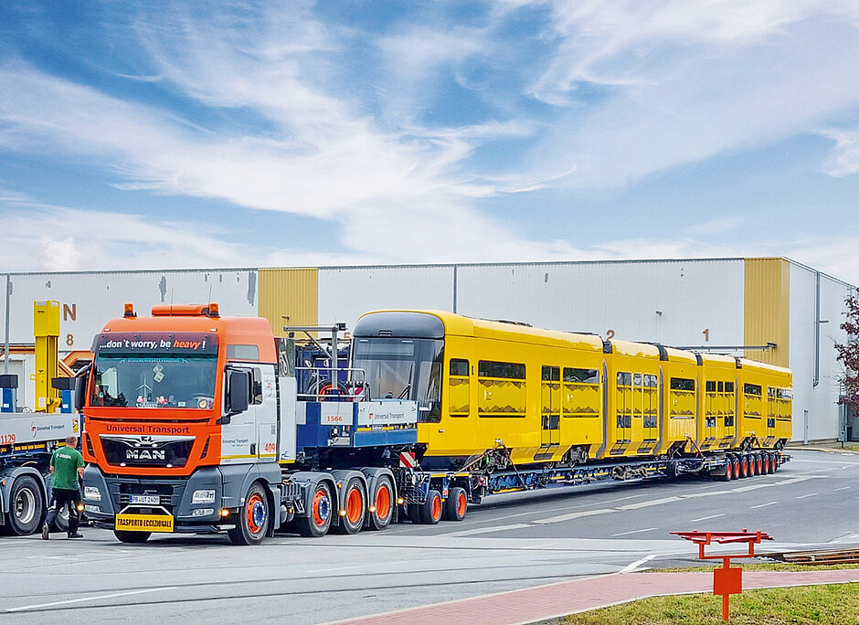 Nach umfangreicher Tourenplanung hatte UTM im vergangenen September bereits den ersten der 45 m langen und 58 t schweren Tramwagen ins Dresdner Güterverkehrszentrum befördert. Die dafür gewählte Goldhofer-Kombination besteht aus einer vierachsigen Zugmaschine, einem vorgelagerten zweiachsigen Schwerlastmodul (THP/UT 2) und einem siebenachsigen Semitieflader für Schienentransporte (STZ-H 7) mit Schwanenhals und hydraulischer Rampe. Mit verschieden langen Brückenelementen kann UTM seine Transportlösung an die Größe der jeweiligen Straßenbahn anpassen. Mit dieser Lösung habe man nicht nur das hohe Gewicht der Tram sicher im Griff, sondern sorge auch für eine leichte Manövrierbarkeit mit dem Schienenfahrzeug, so Peter Klemenz als Projekt-Manager für Schienenfahrzeuge bei UTM in Eisenhüttenstadt.