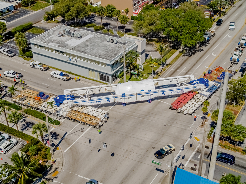 Die große Herausforderung bei dem Transport waren eben die Highways, die einer Höhenbeschränkung von 5,5 m unterliegen, sodass die Ladung nicht auf der Ladefläche der Module gefahren werden konnte. Edwards verfügt über jahrelanges Know-how und vereint dies mit seiner Goldhofer-Seitenträgerbrücke vom Typ Faktor 5 sowie seinem großen Pool an Goldhofer-Schwerlastmodulen. »Mit diesem Transport-Equipment und unserem sehr erfahrenen Team war es für uns wie tägliche Routine, diesen Transport zu bewältigen«, erläuterte Tobias Epple, Director Business Development Europe bei Edwards.
