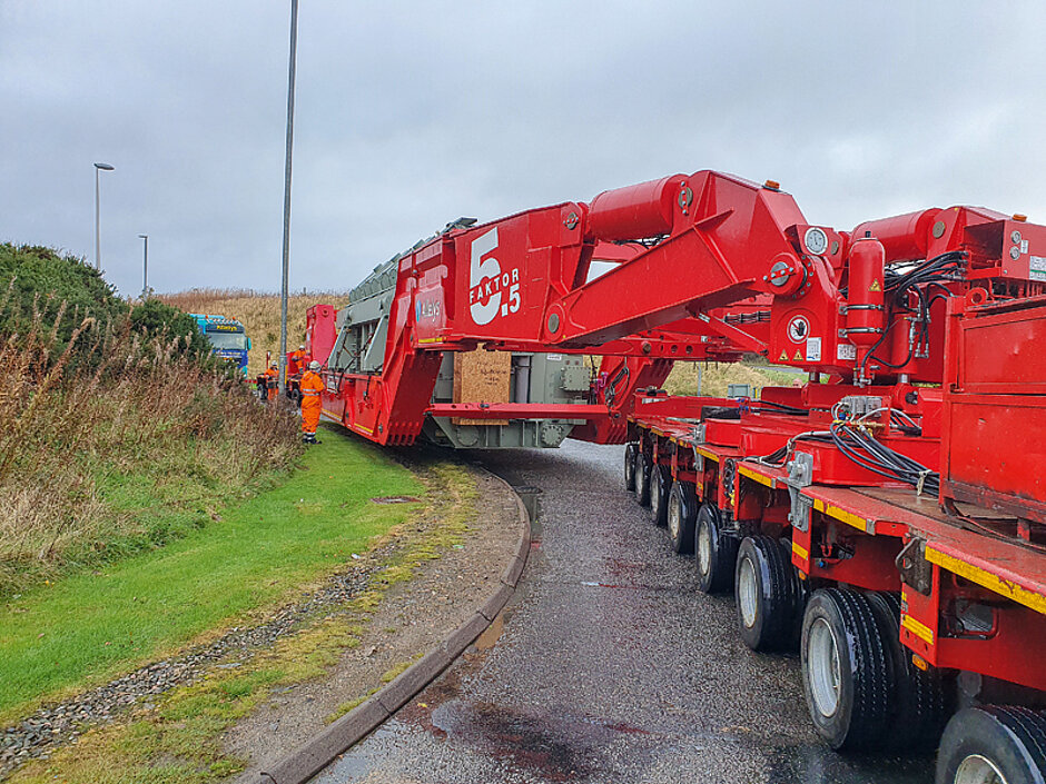 Gleich zu Anfang des Transports zeigte sich, dass dies eine gute Entscheidung war. Die Strecke führte nach der Hafenausfahrt in Peterhead gleich mit einer Rechts-Links-Kombination in einen kurzen steilen Anstieg – eine Situation, die auch dem Fahrer eines konventionellen Lkw-Anhängers hohe Konzentration abverlangt. Dank minutiöser Planung und Vorbereitung konnte der von der Polizei begleitete und insgesamt 70 m lange Lindwurm mit Umsicht und Sorgfalt diese Hürde ebenso bewältigen, wie die noch folgenden 90°-Kurven, Kreisverkehre und Brückenbegrenzungen. »Besonders hilfreich erwies sich die Möglichkeit, die Goldhofer-Kesselbrücke in einer kurzen Transportkonfiguration von zehn Achsen vorn und zehn Achsen hinten zu fahren. Damit sind wir bedeutend wendiger und vor allem wirtschaftlicher«, so Firmeninhaber David Allely.