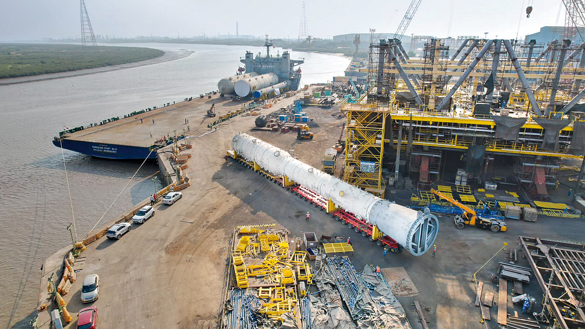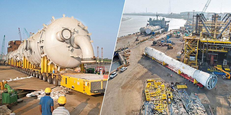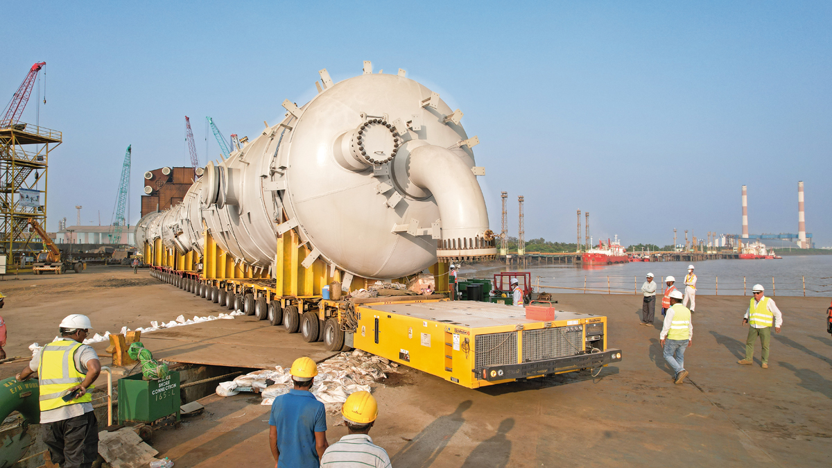 Zum ersten Mal in Indien überhaupt nutzte Prism die Möglichkeit des Seitenladens und -entladens der Frachten. Eingesetzt wurden dafür die selbstfahrenden PST-Module von Goldhofer. Die hohe Präzision und Manövrierfähigkeit ermöglichten es, die komplizierte Aufgabe auf engstem Raum zu erfüllen. Ab Dezember 2022 verließ die Fracht den Hafen von Mundra in sieben Konvois zur Rajasthan-Raffinerie, einem Raffinerie- und Petrochemiekomplex in Barmer (Rajasthan). Anschließend stand Prism vor der Herausforderung, die 600 km lange Straßenstrecke von Mundra nach Barmer zu bewältigen. Entlang dieser Route begegneten die Teams insgesamt sechs Bahnübergängen. Um den reibungslosen Durchgang der Konvois zu ermöglichen, mussten die Transportroute und -zeiten mit den indischen Eisenbahnen koordiniert und die Bahnübergänge zeitweise gesperrt werden. Ebenfalls musste Prism im Voraus Genehmigungen für die Abschaltung zahlreicher Hochspannungsleitungen einholen.