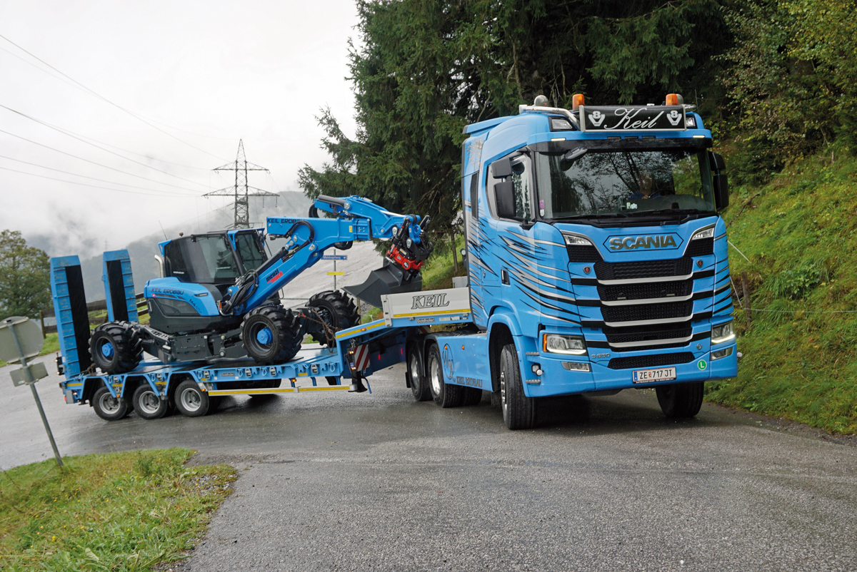 Für das erfahrene Team von Keil stand dieses Mal auf dem Plan, einen Schreitbagger zu einer Baustelle unterhalb des Kitzsteinhorns auf über 3 000 m zu transportieren. Die Route führte durch enge Straßen und alpines Gelände. »Unsere anderen Auflieger kamen schnell an ihre Grenzen, wenn es um die Wendigkeit in Kurven ging«, erklärte Brennsteiner. Ein Lenkeinschlag der »MPA«-Achse von 60 Grad macht für das Team von Keil hierbei einen entscheidenden Unterschied. Er betonte die Bedeutung der Leistungsfähigkeit des »MPA«: »Meist sind die Abladestellen hoch in den Bergen nicht im Lot und das Be- oder Entladen erfolgt unter schrägen Bedingungen. Demnach muss unser Tieflader kurz, wendig, flexibel, sicher und robust, aber relativ leicht sein und darüber hinaus für das alpine Gelände einen hohen Lenkeinschlag sowie hohen Achshub aufweisen.«