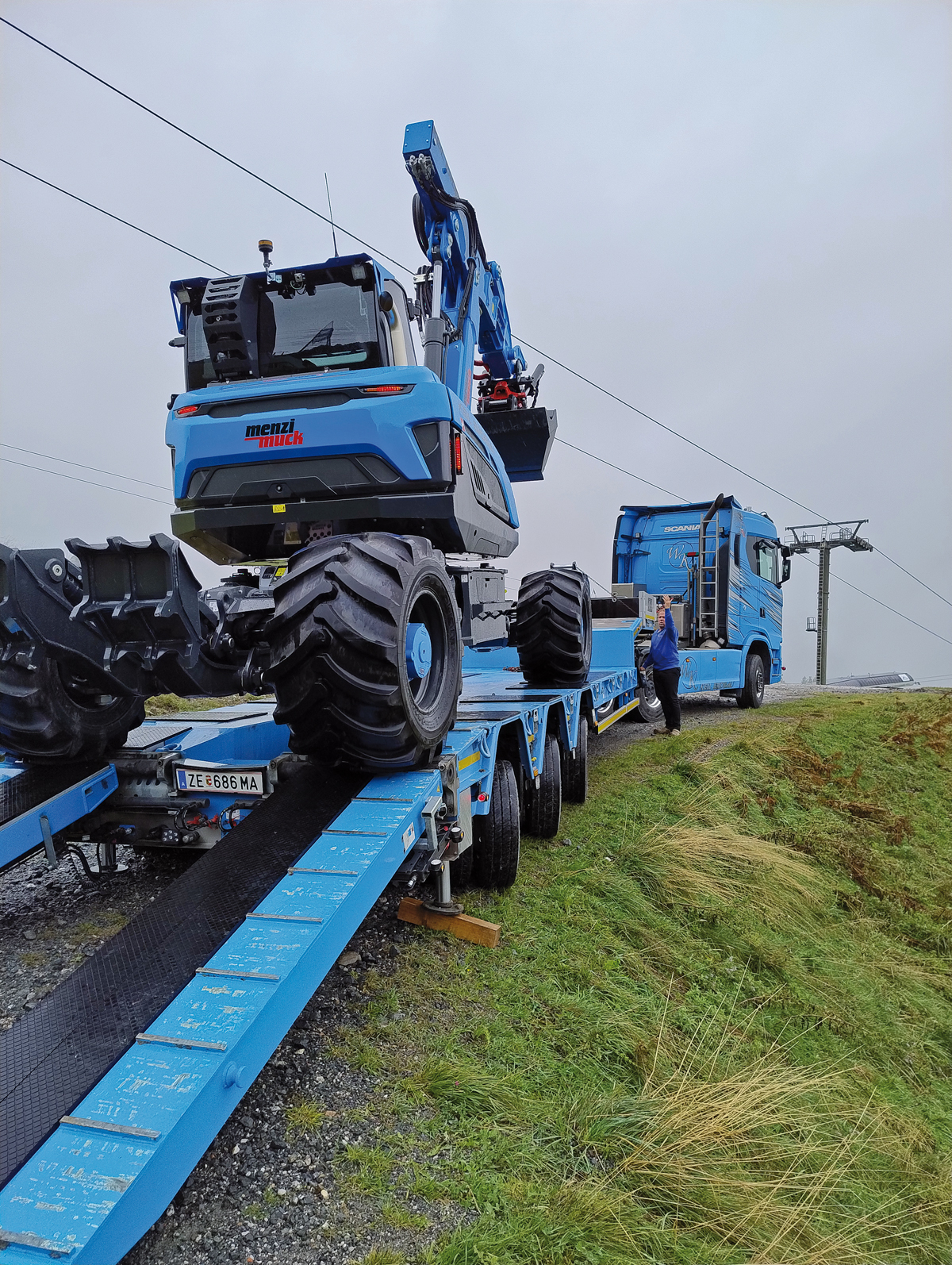 Am Zielort angekommen, wurde der Bagger sicher entladen. Mithilfe der Goldhofer-eigenen »SmartControl«-Steuerung und des hohen Achshubs von ± 350 mm konnte das Team von Keil sich präzise an das unebene Gelände anpassen, was das Entladen unter schwierigen Bedingungen erleichterte. Die Notwendigkeit eines zuverlässigen und robusten Semiaufliegers verdeutlicht Brennsteiner: »Es geht steil bergauf, und manchmal ist der Sturm oben in den Bergen so heftig, dass ich nur mit größter Kraft die Fahrertür aufmachen kann. Ich muss sie festhalten, sonst reißt der Sturm sie aus den Angeln.«