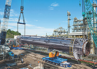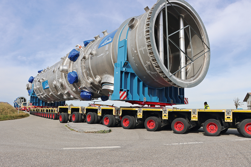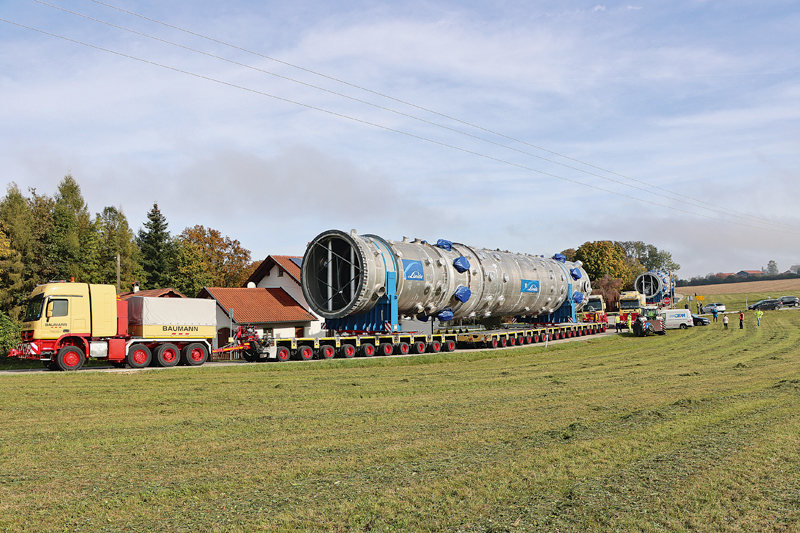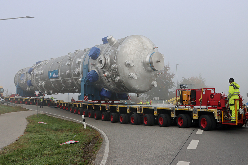 Der Transport der beiden spiralgewickelten und rund 275 t wiegenden Wärmetauscher musste aus Sicherheitsgründen am Tag durchgeführt werden. Aufgrund der immensen Abmessungen der beiden Fahrzeugkombinationen war es erforderlich, dass sich der Konvoi vorwiegend über Nebenstraßen bewegte. Zum Einsatz kam dabei für den mit 274 t »leichteren« Wärmetauscher ein Nachläuferzug aus 18 + 10 Achslinien vom Typ THP/SL-L. Dieser brachte es auf eine Länge von 69 m und ein Gesamtgewicht von 433 t.