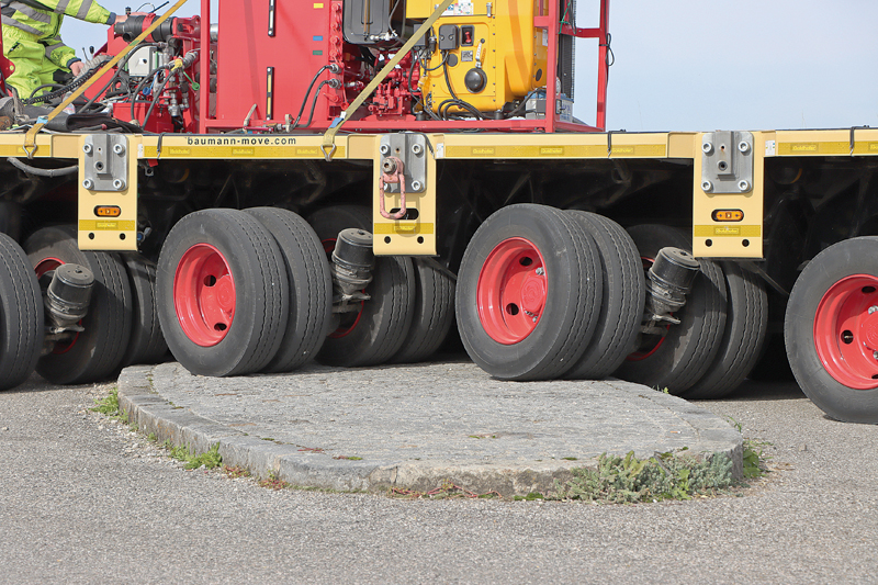 Seit Jahren fahren wir mit Goldhofer-Schwerlastmodulen, die für die steigenden Anforderungen in Bezug auf die Achslasten nun Zug um Zug durch die neue Baureihe THP/SL-L ausgetauscht wurden«, berichtet Baumann-Fuhrparkleiter Matthias Kirschner. »Die neuen leichtgewichtigen Module sind wesentlich leistungsstärker und durch ihre verstärkte Rahmenkonstruktion und die bewährte Pendelachstechnologie mit Kugeldrehkranzverbindung sehr robust«, so Kirschner. Die neue Baureihe THP/SL-L von Goldhofer leistet 26 t Achslast je Achslinie bei einer Geschwindigkeit von 20 km/h. Ihre Bauweise und hohes Biegemoment bei geringem Eigengewicht erlauben eine hohe Einsatzfrequenz gerade im Straßentransport.