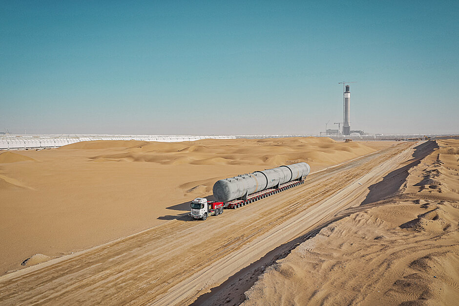 Um die je 52 m langen und 235 t schweren Ladungen zuverlässig über die ca. 90 km lange Strecke zu bewegen, waren aufwendige logistische Vorarbeiten und Genehmigungen notwendig. Die Fahrt erfolgte dabei immer im Zweier-Konvoi, mit jeweils 30 Goldhofer-Schwerlastachslinien und einer Mercedes-Actros-Zugmaschine. So erreichten alle Tanks pünktlich den kurz vor Bauabschluss stehenden Solarpark. Die Tanks werden mit einem Ausdehnungsgefäß als Teil eines Überlaufspeichersystems eingesetzt, in dem das expandierte Thermoöl gespeichert und wieder verwendet werden kann. Mit einer installierten Leistung von 5 000 MW im Endausbau wird die teils bereits in Betrieb befindliche Anlage der weltweit größte Solarpark sein.