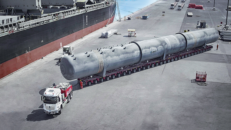 Im Anschluss an den Transport haben die Tanks noch etwa 100 m am Haken eines 400-t-Raupenkrans zurückgelegt, um dann auf den vorbereiteten Fundamenten montiert zu werden. Auch Goldhofer-Gebietsverkaufsleiter Middle East Dean Exner zeigte sich hinsichtlich des Megaprojekts seines Kunden hoch erfreut. »Wenn es darum geht, schwerste und voluminöse Frachten auf und abseits der Straße an ihr Ziel zu bringen, dann sind die THP/SL-Module oft die wirtschaftlichste Lösung. Sie erlauben es, eine enorme Nutzlast mit ausdauernden Einsatzzeiten zu kombinieren.« t