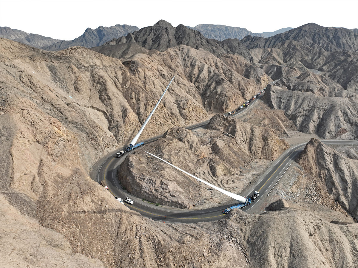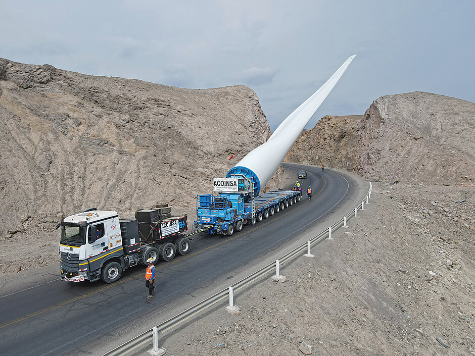 Auch international kommen die Goldhofer-Lösungen für den Transport von Wind-Komponenten zum Einsatz. Der peruanische Schwerlast-Spezialist Transportes Acoinsa hat Mitte letzten Jahres Komponenten für den Windpark Wayra II in der Ica-Region transportiert. Insgesamt 93 Windflügel mit jeweils 77 m Länge galt es zu transportieren. Um diese Aufgabe zu lösen, setzte das Team von Acoinsa mit der »FTV 850« auf die mittlerweile dritte Generation der Goldhofer-Flügeltransportvorrichtung. Kombiniert wurde diese mit einer zwölfachsigen Goldhofer »THP/SL«-Kombination. Für die 129 km lange Route vom Hafen bis zum Windpark setzte Acoinsa zwei »FTV 850« parallel ein. Enge und bewohnte Gebiete, Stromleitungen, Kreisverkehre, Bäume und nicht zuletzt herausfordernde Serpentinenstraßen erforderten das Anheben der Rotorblätter während 50 Prozent der gesamten Transportstrecke. Dank bis zu 60° Liftwinkel ließen sich selbst diese Passagen meistern.
