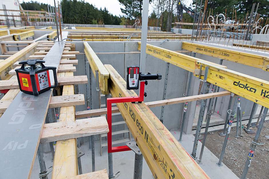 Hierbei handelt es sich um eine speziell geformte Latte, auf der ein Laserempfänger montiert wird. Dank ihrer Geometrie kann die Latte einfach frei pendelnd an den Träger gehängt werden. So hat der Mitarbeiter die Hände frei und kann allein die Baustütze in die erforderliche Position bringen. Um welche Höhe der Träger versetzt werden muss, erfährt er vom Sendemodul des Lasers.