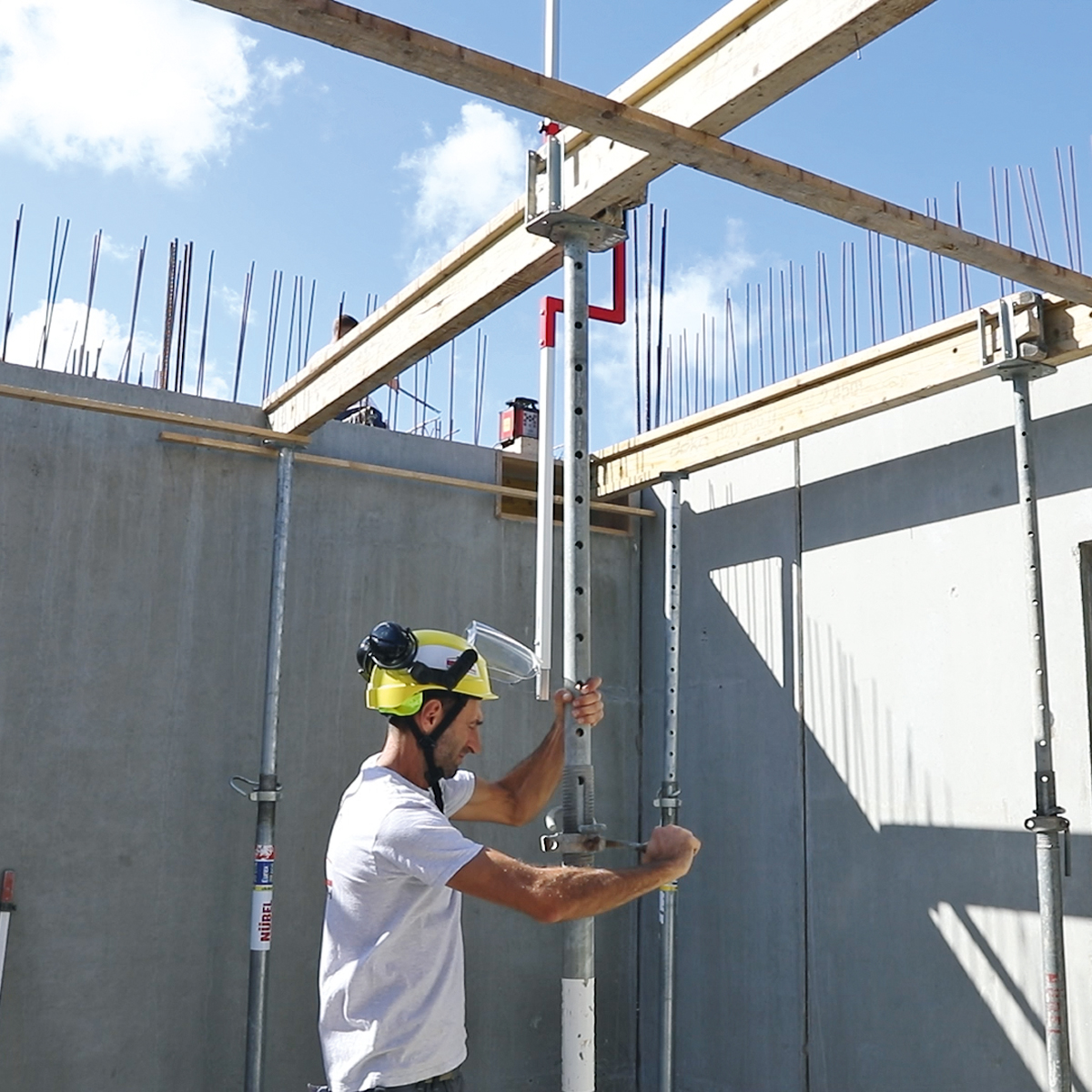 Auf den meisten Baustellen sind noch zwei Mitarbeiter erforderlich, um die Höhe von H20-Trägern einer Deckenschalung richtig zu positionieren: Einer steigt auf die Leiter und gibt an, um wie viel der Träger nach oben bzw. nach unten versetzt werden muss, der andere bleibt am Boden und stellt die Baustütze ein, auf der der H20-Träger liegt. Eine Vorgehensweise mit Nachteilen: Es sind zwei Personen erforderlich – eine muss auf eine Leiter steigen, was ein gewisses Gefahrenpotenzial darstellt. Und zudem muss die Leiter regelmäßig von einem Deckenträger zum anderen transportiert werden, was Zeit kostet. Dies soll dank der Stachel-Latte von Gottlieb-Nestle jetzt der Vergangenheit angehören.