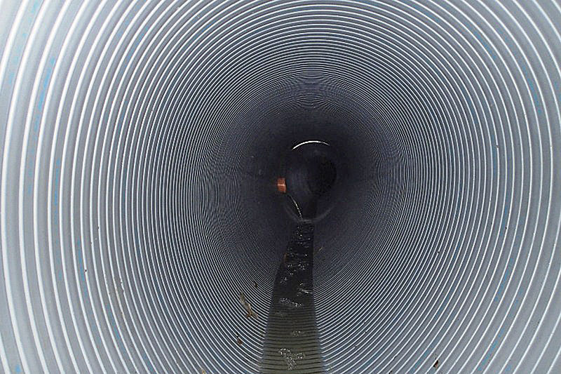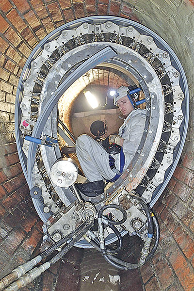 Unter kontrollierter Vorflut wurde der 220 m lange Kanalabschnitt mit dem SPR-Liner ausgekleidet, indem ein Profilstreifen aus PVC im Altrohr zu einem neuen Rohr gewickelt wurde. Die hierfür im Altrohr installierte Wickelrohrmaschine wanderte mit jeder Umdrehung mit dem anwachsenden SPR-Rohr bis zum Endpunkt mit. Der Wickelrohrrahmen der Maschine wurde unter Berücksichtigung des für die Statik benötigten Ringraums an das Eiprofil des zu sanierenden Rohres angepasst. Die ca. 12 000 m Profilstreifen wurden von oberirdisch nacheinander stationierten Trommeln über den Revisionsschacht in den Kanal eingeführt und von der Maschine mithilfe einer Nut- und Feder-Mechanik zu einem wasserdichten Liner verbunden. So konnte ohne Unterbrechung die Installationslänge saniert werden. Seine statische Eigenschaft erhielt der neue Liner durch die Ringraumverfüllung zwischen dem Wickel- und dem Altrohr. Hierfür wurden ca. 80 m³ eines Hochleistungsmörtels in den für die Statik notwendigen Ringraum eingebracht. Nach der Aushärtung übernimmt die Mörtelschale mit einer Beton-adäquaten Festigkeit die statische Lastaufnahme des Sanierungsgewerks. Der PVC-Liner dient somit als Schalung, der die Mörtelschale künftig vor dem korrosiven Angriff des Abwassers schützt.