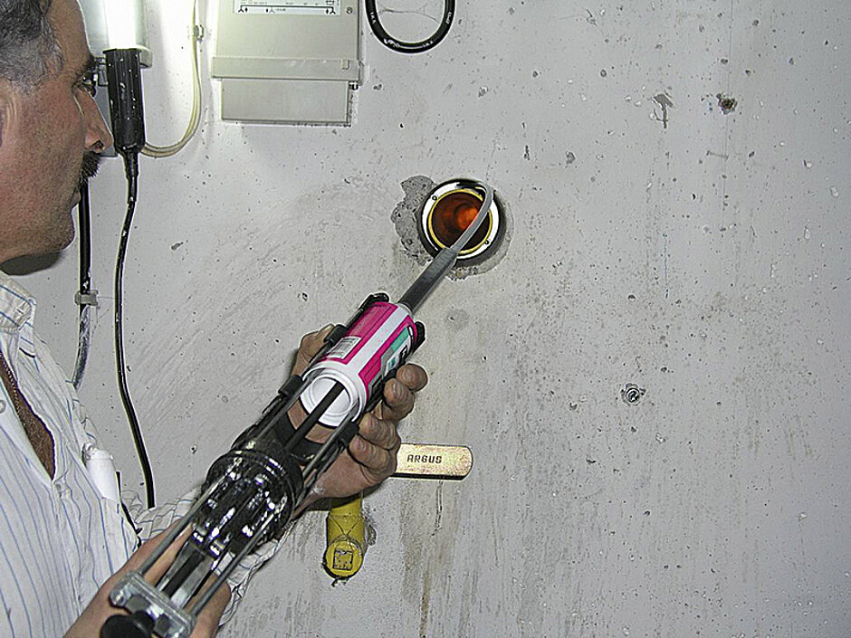 Montagegruben vor Gebäuden sind insbesondere bei Reihenhausbebauung mit gestaltetem Vorgarten, aufgesetzten Außentreppen oder liebevoller Bepflanzung oft mit erheblichem (Kosten-)Aufwand verbunden. Sprechen die örtlichen Gegebenheiten nicht prinzipiell gegen das Arbeiten mit Erdverdrängungsraketen, steht Zappo für eine neue Qualität in der Baustellenabwicklung. Der Start der »Rakete« erfolgt durch eine 100er-Kernbohrung aus dem Keller heraus. Mitverlegt werden ineinander gesteckte Vortriebsrohre, die auch in gasdichter Ausführung geliefert werden können, mit einem Außendurchmesser von 63 mm oder 75 mm (Gas). Längen von bis zu 15 m sind im Vorgartenbereich bei entsprechenden Bodenverhältnissen und mit der notwendigen Erfahrung der Anwender oft problemlos zu bewältigen. Die Erdverdrängungsrakete wird an der Grundstücksgrenze im Gehwegbereich entnommen, sodass auf dem Kundengrundstück keine Tiefbauarbeiten erforderlich sind. Anschließend erfolgt die direkte Abdichtung des Vortriebsrohres zum Gebäude mit der Zappo-Hauseinführung. Im Keller wird auf das Vortriebsrohr zuerst ein Moosgummiring und dann eine Außenabdichtung mit integriertem Injektionsschlauch aufgeschoben. Der Moosgummiring übernimmt den Verschluss des Bohrkanals vor der Wand im Erdreich. Die quellfähige Gummipressdichtung sorgt für den Verschluss der Bohrung zur Gebäudeinnenseite. Die Montage der beiden Komponenten in korrekter Position erfolgt per Montagehilfswerkzeug, auf dem über eine Skala lediglich die gemessene Wandstärke eingestellt werden muss. Im Anschluss wird per Injektionsschlauch ein DVGW-zugelassenes Zwei-Komponenten-Expansionsharz in den Außenbereich eingeleitet. Durch das Harz werden Hohlräume und Ausbrüche im Außenbereich sicher verpresst. Gleichzeitig wird die vorhandene Gebäudeabdichtung, die im Bereich der Kernbohrung zerstört wurde, vom Expansionsharz vollflächig umschlossen.