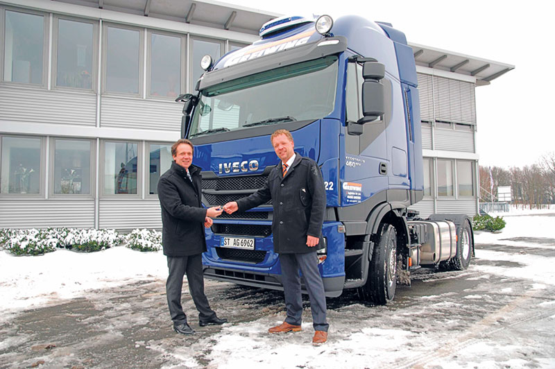 Kürzlich wurde in der Grevener Greiwing-Zentrale der 95. Stralis übergeben. Es handelt sich dabei um den ersten von 50 für dieses Jahr geplanten Stralis Hi-Way, einen 440 S 46 T/P mit der Schadstoffklasse Euro V/EEV. Greiwing sieht darin für seine nutzlastsensiblen Transporte schon aus Gewichtsgründen eine gute Wahl, obwohl bei Iveco durch die HI-eSCR-Technik ohne Abgasrückführung das Mehrgewicht für Euro VI recht moderat ausfällt. Aufgrund einer aktuell nicht gegebenen Besserstellung über eine günstigere Mautklasse für Euro-VI-Fahrzeuge ist zudem ein Kostenvorteil für Euro VI nicht zu erkennen. Sollte sich hier die Situation ändern, will Greiwing auf Euro VI umschwenken.