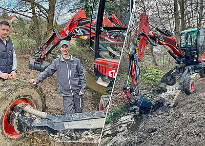 »In der Praxis spart das wirklich viel Arbeit«, erklärt Sven Fallert. »Beispielsweise haben wir für einen Kunden eine stark bewachsene Bestandsfläche gerodet. Da wir zuvor die Grenzen des Flurstücks eingelesen hatten, wurde bereits beim ersten Durchgang der vordefinierte Bereich mit dem Anbaumulcher bearbeitet – und auch nur dieser.« Ob Wald oder Feld, ob Berg oder Fluss, auf seinen hydraulisch verstellbaren Füßen gelangt der »S12« überall hin. Und weiß dank der einfachen Synchronisierung zwischen Büro und Bagger über die Cloud stets genau, was er zu tun hat. »Die Cloud-Lösung spart uns viel Zeit und Wege. Die Daten sind da, wo man sie braucht, und wir können auf ein kostenintensives „Turnschuhnetzwerk“ verzichten«, erklärt Fallert.