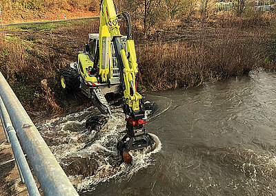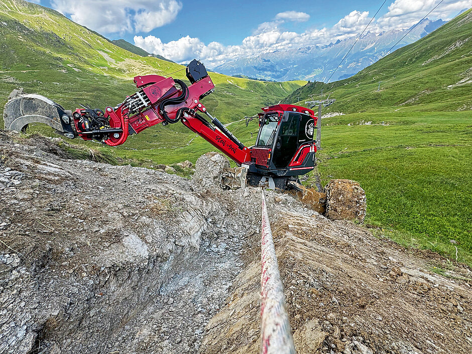 Bei Arbeiten an extremen Hanglagen, in unwegsamen Gebieten und selbst im tosenden Gebirgsbach ist der Schreitbagger ein verlässlicher Partner, mit dem man selbst ohne Sicht hoch präzise arbeitet. »Mit der Maschinensteuerung weiß der Schreitbagger immer, wo er ist, das ist der größte Vorteil für uns«, bestätigt Fallert. Das 3D-Baggersystem Leica »iCon iXE3« greift auf 3D-Geländemodelle und modernste GNSS-Technologie zurück. Damit »sieht« der am Schreitbagger angebrachte Löffel, wo das zu modellierende Gelände verläuft, selbst wenn der Maschinist keine direkte Sicht hat.