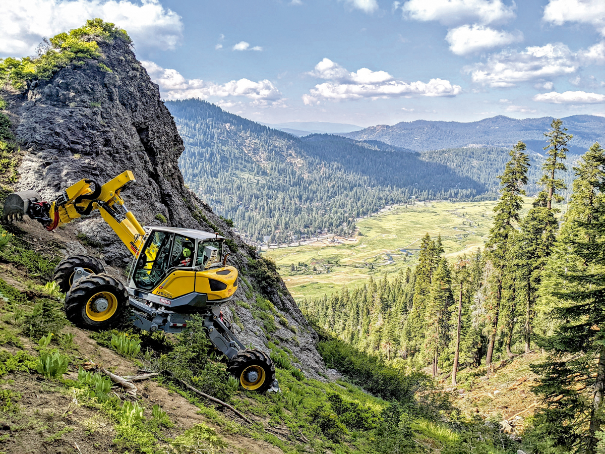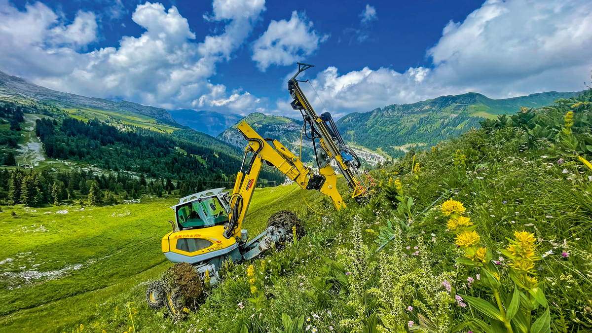 Wer sich in die extremsten Steigungen begibt, kann das bei den »M5x«-Modellen laut Menzi Muck bis zu 45° in der Falllinie oder 30° in der Schichtlinie gefahrlos tun – auch dank einer maximalen Breitenverstellung von 6 m für die nötige Standfestigkeit. So ermögliche die besondere Anordnung der Drehpunkte am Chassis eine horizontale und vertikale Parallelverstellung aller Räder. In Verbindung mit einem stufenlosen Antrieb, einer automatischen Drehzahlanpassung der Räder und einer hydraulischen Differentialsperre soll sich der Bediener auch auf rutschigem oder weichem Untergrund stets auf die maximale Traktion verlassen können. Dazu kommt noch eine Wattiefe von 2 200 mm für tiefere Einsätze im nassen Element. Alle Modelle vereint zudem eine Maschinenhöhe unter 2,55 m, wodurch eine einfache Verladung in einem 40-Fuß-High-Cube-Container ermöglicht wird.