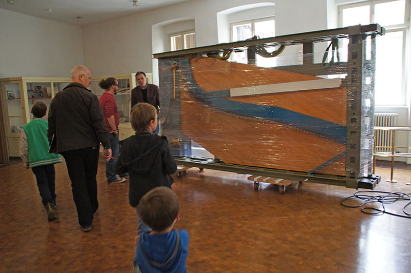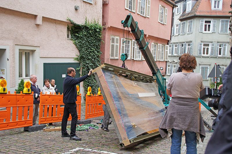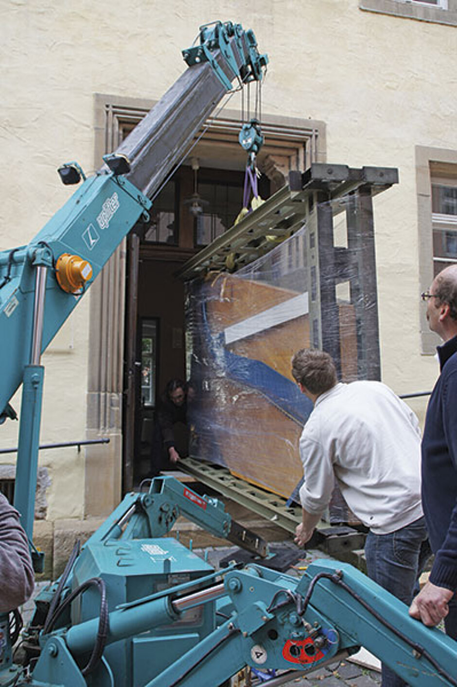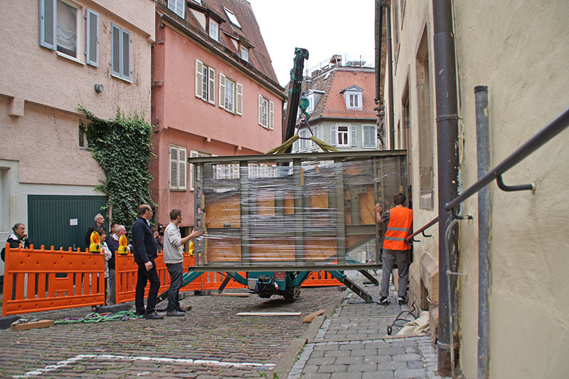Mitte September 2013 wurde das Klavier in Einzelteilen nach Tübingen angeliefert. Vom Lkw durch die Pfleghof-Tür nahm der Transport eineinhalb Stunden in Anspruch, viele Passanten betrachteten den ungewöhnlichen Umzug in der Tübinger Altstadt. Die sperrige Fracht war in Stahlträgern eingebunden und gesichert, sodass sie mit einem Minikran Typ Maeda MC 285-2 über Schlupfen angehoben und behutsam bewegt werden konnte.