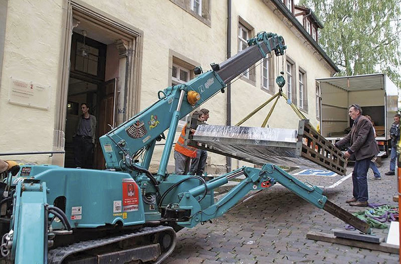 Nachdem das Klavier durch die Tür geschafft war, musste es noch eine Treppe nach unten überwinden. Hier kam wieder der Maeda-Minikran zu Hilfe: Zuerst wurde ein Holzpodest für die Treppe ausgelegt, damit sich dem Kran eine ebene Fahrt nach unten bot. Unten angekommen, wurde er wieder aufgebaut, das Klavier kam an die Schlupfen und konnte somit die Treppen sicher hinuntergehoben werden.Da der Minikran neben Benzin auch per Batterie betrieben werden kann, konnte im Innenbereich umweltschonend und ohne Abgasemissionen gearbeitet werden. Ein angenehmes Arbeiten machte auch der geringe Lärmpegel aus.Nachdem das Klavier im Kellergewölbe angekommen war, wurde es an die gewünschte Stelle gebracht und montiert.