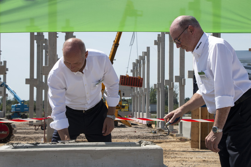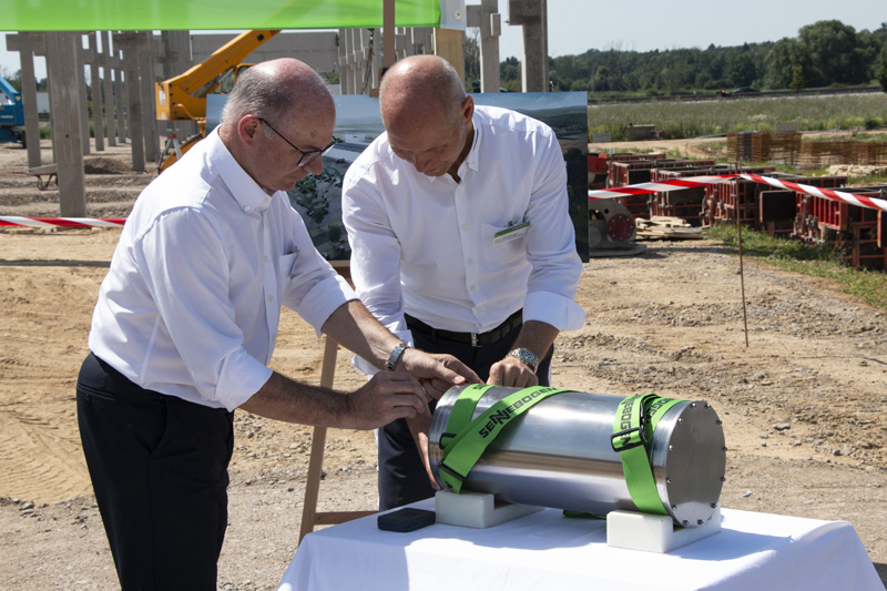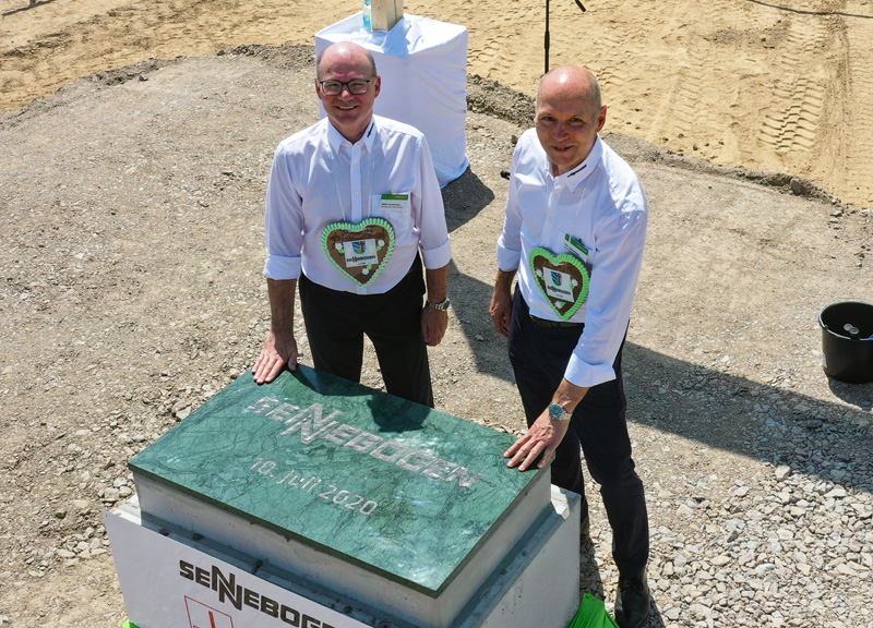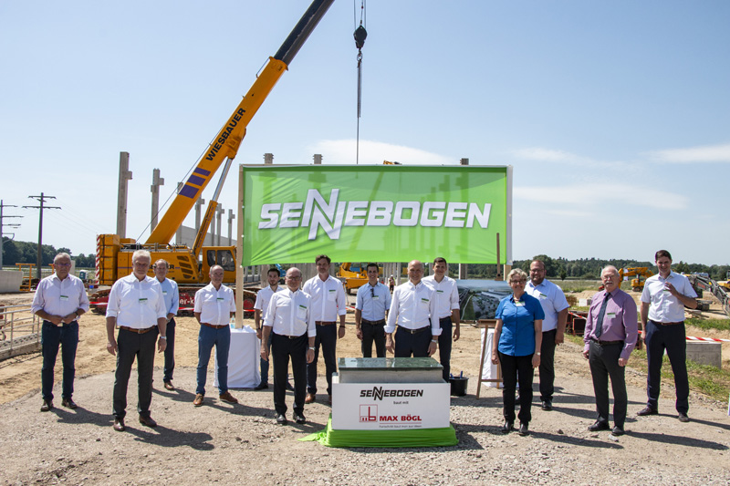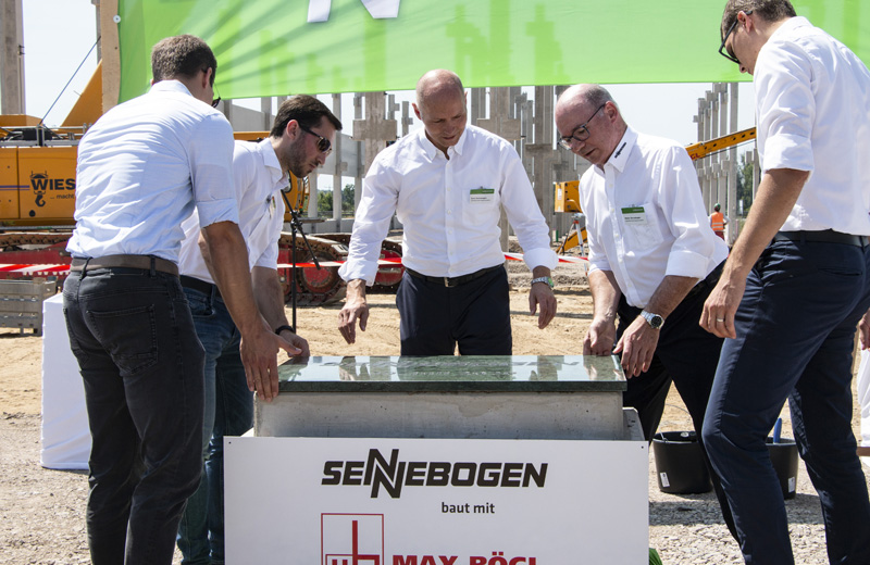 Die ersten Bauschritte sind bereits getan, Generalunternehmer Bau ist die Firma Max Bögl. Geplant und koordiniert wird das Bauvorhaben durch die Koch Gruppe als Generalplaner, und selbstverständlich kommen für die einzelnen Bauschritte auch die hauseigenen SENNEBOGEN Krane zum Einsatz. Ohne Kran, dafür aber mit umso tatkräftiger Unterstützung aller Baubeteiligten wurde zum Schluss eine Zeitkapsel im Boden versenkt, darin neben Münzen und Bauplänen auch eine aktuelle Tageszeitung, um auf die Bedeutung des Vorhabens hinzuweisen und um einen reibungslosen Bauverlauf zu bitten.