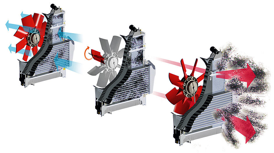 Das spezielle Flügelblattprofil des Cleanfix-Umschaltventilators hingegen will eine hohe Kühlleistung bei geringem Strömungswiderstand und somit eine effiziente Kühlung unterstützen. In regelmäßigen Abständen schaltet der Ventilator von Kühlung auf Reinigung um. Dazu drehen sich die Flügel über die Querstellung um die eigene Achse. Der Ventilator ändert bei voller Umdrehung die Richtung des Luftstroms und bläst so den Kühler frei von Verunreinigungen.