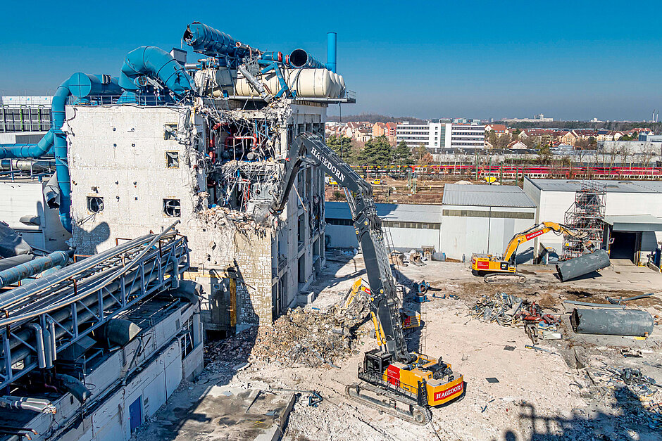 »Ein Gelände wie in Nürnberg bauen wir nicht alle Tage zurück. Bei solchen Dimensionen – 600 000 m³ umbauter Raum – brauchen wir nicht nur unsere leistungsstärksten Maschinen wie Deutschlands größten Abbruchbagger, den KMC 1600. Nur mit gut durchdachter Planung schaffen wir innerhalb kurzer Zeit einen neuen Standort mit Zukunft«, sagt Hagedorn-Projektleiter Sebastian Watermann.