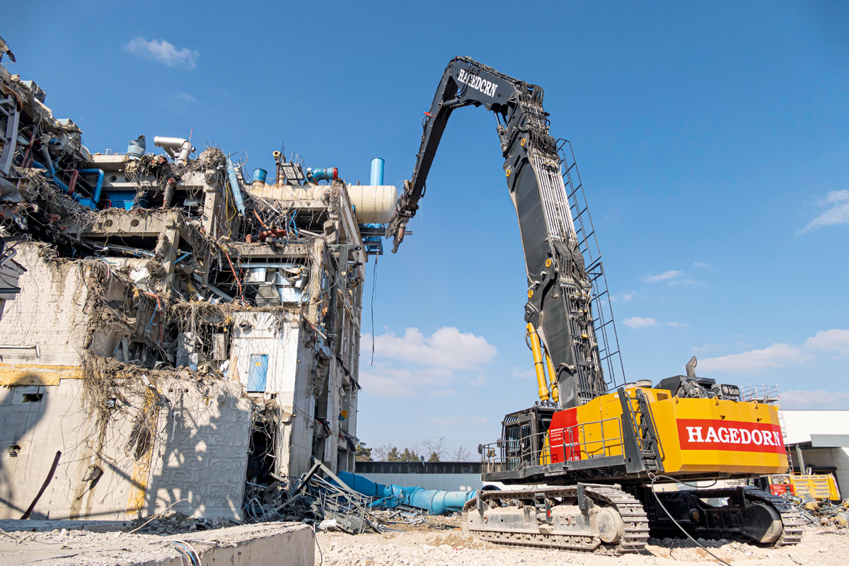 Für das Hagedorn-Team ist es das bisher größte Abbruchprojekt des Jahres, nicht nur die Geschichte des Druckerei-Komplexes ist mächtig, auch die Tiefdruckmaschinen sind »wahre Giganten«. Jede Maschine – bestehend aus Stahl, technischen Kleinteilen und Druckfarbe – ist 600 t schwer und 18 m lang, ausgestreckt über drei Stockwerke. Dazu 3 m breite Papierbahnen, die über hunderte von Umlenkrollen millimetergenau geführt wurden. Massive, 18 cm dicke Stahlplatten, zahllose Leitungen, riesige Abscheider für die Lösemittelrückgewinnung und die mächtigen Fundamente stellen das Hagedorn-Team beim Abbruch vor besondere Herausforderungen.