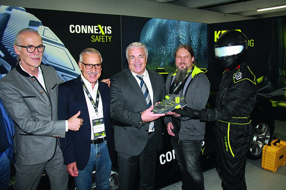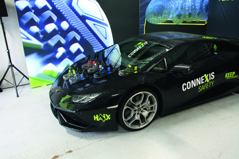 Nieselregen und leichter Benzingeruch lagen in der Luft, als der »Haix-Lamborghini« in die Boxengasse am Hockenheimring einfuhr. Die Präsentation der Schuhentwicklung war dem Unternehmen aus dem niederbayerischen Mainburg gelungen. Im Mittelpunkt stand der »Connexis Safety«, ein Sicherheitsschuh, der vor allem durch seine neue Technologie auffallen will.