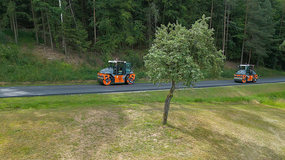 Das Besondere an der Baustelle auf der bayerischen Bundesstraße zwischen dem Schöntal und Grafenkirchen ist, dass hier mit temperaturabgesenktem Asphalt gearbeitet wird. Von den geringeren Aerosolen profitieren sowohl die Umwelt als auch die Mitarbeitenden der beauftragten Georg Huber Inh. Josef Rappl GmbH vor Ort. Gleichzeitig stellt das temperaturabgesenkte Material die Beteiligten vor Herausforderungen: Das Zeitfenster für den Einbau ist verkürzt. Unterstützung erhält der Bediener durch Smart Doc und Smart Compact. Denn sowohl durch die automatisierte Regelung der Verdichtung als auch durch die volle Transparenz über die bereits erreichten Werte werden Überfahrten effektiv reduziert. Im Umkehrschluss: Das zur Verfügung stehende, verkürzte Zeitfenster für die Verdichtung wird bestmöglich genutzt.
