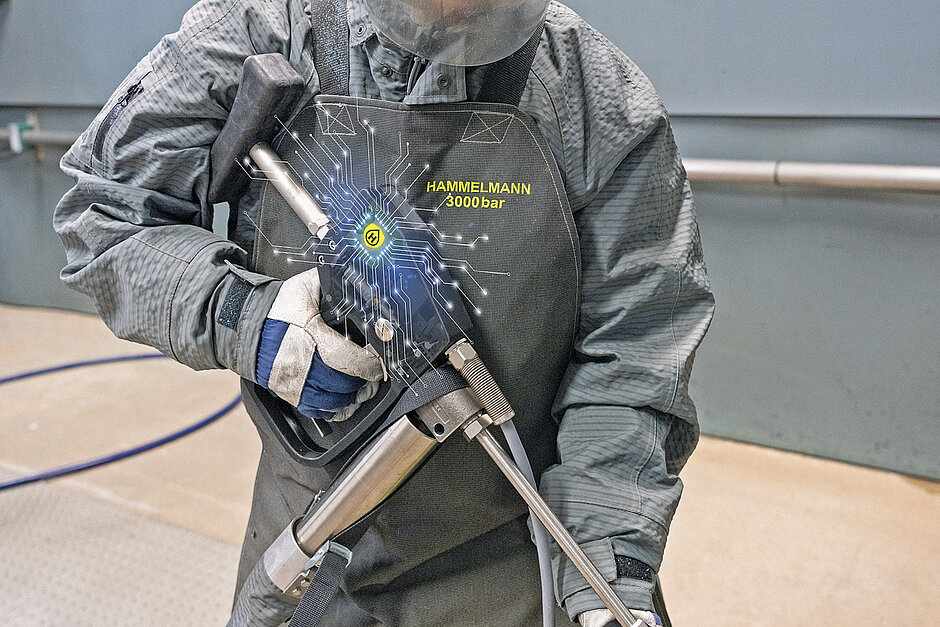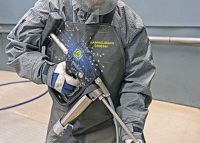 Manuell geführte Hochdruckspritzpistolen sind gängige und leistungsfähige Werkzeuge für den Einsatz von Wasserhochdruck in zahlreichen Anwendungsbereichen. Dabei stellen die hohen Betriebsdrücke gleichsam hohe Ansprüche an die technische Ausstattung und eine korrekte Handhabung, um zuverlässigen Arbeitsschutz zu gewährleisten. Hammelmann wirkt mit der Entwicklung des »xPRO«-Sicherheitsmoduls einem großen Risikofaktor entgegen: Bei Stolpern oder Gleichgewichtsverlust des Anwenders wird der Wasserstrahl bei gängigen Hochdruckspritzpistolen erst durch das manuelle Lösen des Hebels am Handventil gestoppt. Im schlimmsten Fall kann in solchen Situationen nicht umgehend reagiert werden. Bediener und Personen in der näheren Umgebung können durch die unkontrollierte Kraft des Wasserstrahls verletzt werden. In solchen Situationen greift die intelligente Sicherheitsautomatik von »xPRO«, unabhängig von der manuellen Bedienung der Hochdruckspritzpistole, automatisch ein und minimiert aktiv das Gefahrenpotenzial.