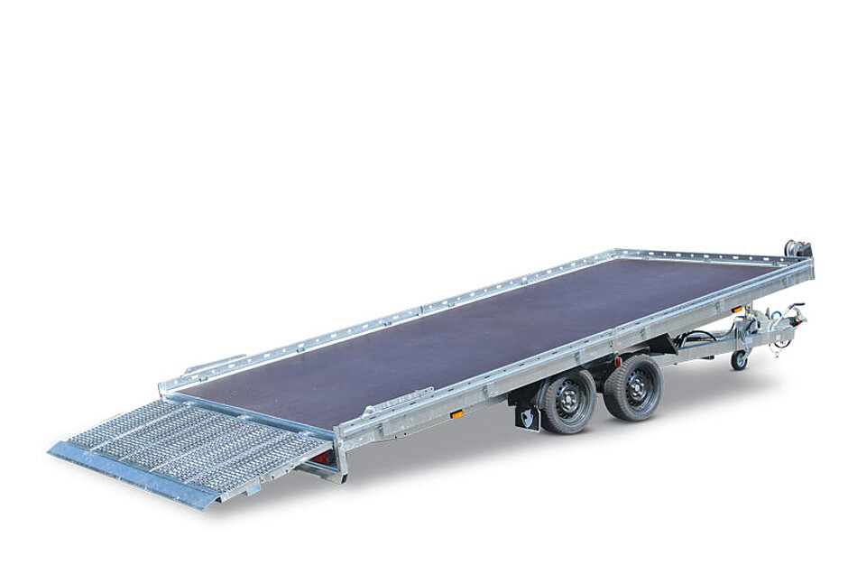 Weiters bietet der Anhänger eine durchgehende, vollständig verzinkte Heckklappe (100 cm) mit Gasdruckfeder und Gitterrost, Winde und Windenstütze, ein hochklappbares Stützrad sowie eine doppeltwirkende hydraulische Bedienung (Parabelfederung bei 455 cm und 505 cm). §