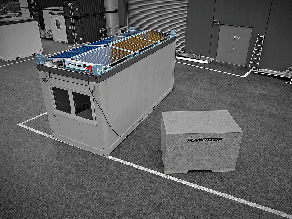 Der Grundgedanke, der hinter der Entwicklung des Powertop steht, ist, Solarenergie dort zu produzieren, wo sie auch gleich verbraucht wird. Darüber hinaus könne die neue Lösung mit ihrer Robustheit und Mobilität punkten. Auch sei sie einfach zu montieren: Powertop wird in einer Mehrwegbox geliefert und kann nach Angaben von Hartl Energy mit wenigen Handgriffen direkt vor Ort auf der Baustelle zusammengebaut werden. Fachpersonal sei hierfür nicht nötig. Das Aufsetzen auf den Container erfolgt mit einem Kran, wird an den ISO-Ecken verriegelt und an den Container Stromeingang angeschlossen. Durch das Plug & Play-Prinzip werde die Stromversorgung nach der Montage sofort gewährleistet. Einmal montiert sei auch das Verstellen und Verheben der Container über die robusten ISO-Ecken jederzeit möglich.