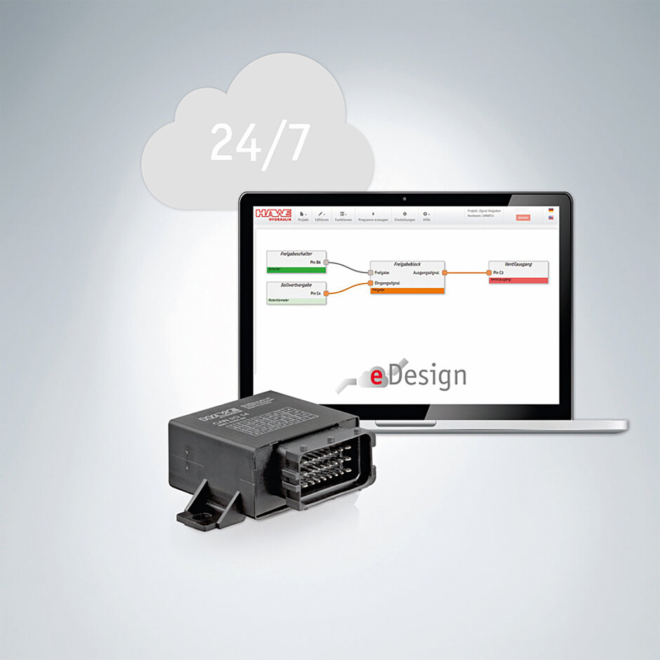 Die Software ist cloudbasiert und dadurch von überall erreichbar. Sie kann über alle gängigen Browser aufgerufen werden. E-Design beinhaltet im Standard bereits viele Funktionen um den CAN-Knoten Typ CAN-IO und den Steckerverstärker Typ EV2S von HAWE Hydraulik zu programmieren. Die im Haus entwickelte Programmieroberfläche ist geeignet, um den Übergang von s/w-Ventiltechnik hin zur Proportionalansteuerung zu erleichtern und ist vor allem für wenig bis mittel komplexe Programmierungen gedacht. Eingebaute Tutorials und Hinweisfenster vereinfachen die Bedienung weiter. §