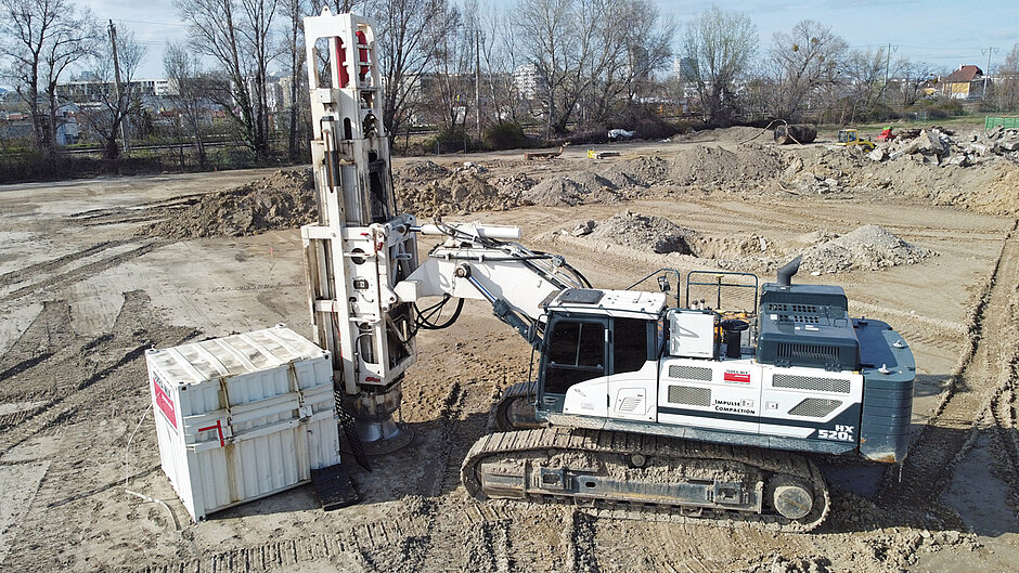 »Vorteil dieser Art der Bodenverdichtung ist der GPS-gestützte Nachweis des Verdichtungserfolgs«, erklärt Martin Müller, in der Terra-Mix-Geschäftsführung für Technik und Einkauf verantwortlich. Das von seinem Unternehmen entwickelte Verdichtungsverfahren könne mit dem kleinsten CO₂-Fußabdruck von allen Baugrund-Verbesserungsmethoden überzeugen. Schwere Hydraulikbagger von Hyundai, geliefert vom österreichischen HD Hyundai-Vertragshändler Mörtlbauer Baumaschinen, sind dabei das Herzstück der Technik. Die Verdichtungstechnik inklusive der Veränderung des Bagger-Auslegers übernimmt Terra-Mix in Eigenregie. Haupteinsatzgebiet der südkoreanischen Großgeräte sind Österreich, Deutschland und mehrere osteuropäische Länder. Martin Müller führt aus: »Für uns sind moderne, kraftstoffsparende Hydraulikbagger als Trägergeräte essenziell. Die 52-t-Bagger von Hyundai überzeugen durch hervorragenden Stahlbau, einen stabilen Unterwagen und eine leistungsfähige Hydraulik zum Antrieb der Verdichtungs-Einheit.« Das Verdichtungsgerät für die Impulsverdichtung hat Terra-Mix selbst entwickelt und komplettiert es zur fertigen Einheit.