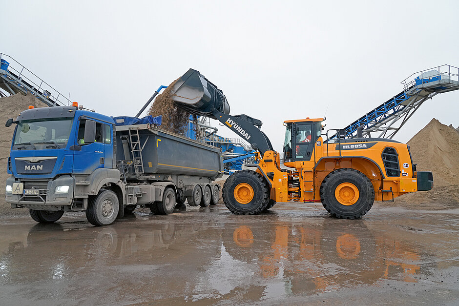 Die modernste Nassaufbereitungsanlage (R-Gestein Niederrheinanlage), markiert die Vorreiterrolle des Unternehmens, das seit rund 15 Jahren Großkunde beim Hyundai-Vertragshändler Hyundai Baumaschinen Nord mit Stammsitz in Bad Bentheim ist. Rund zwölf Radlader und zwölf Mobil- und Kettenbagger beschicken Anlagen, helfen bei der Produktion von Betonsteinen sowie bei der Rückverladung. Das Resultat sind fremd- und störstoffbefreite feine und grobe Gesteinskörnungen, die aus heterogenen Abfallmaterialien entstammen und als homogene Produkte das Werk verlassen und problemlos eingebaut werden können. Zum Angebot gehören Sande, Splitte und Schotter bis zu 0-32. Der »HL985A« wird vermutlich vier Jahre im Einsatz sein und dabei rund 8 000 Stunden leisten.