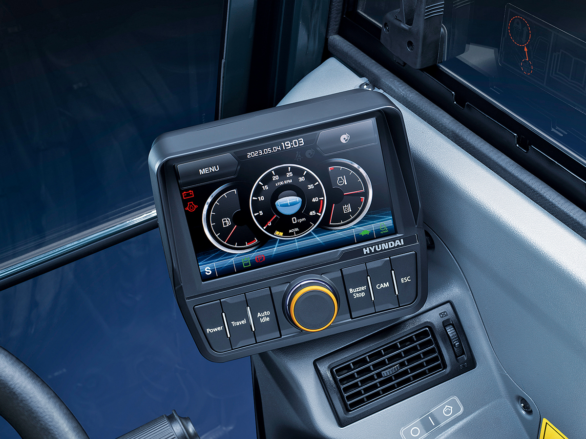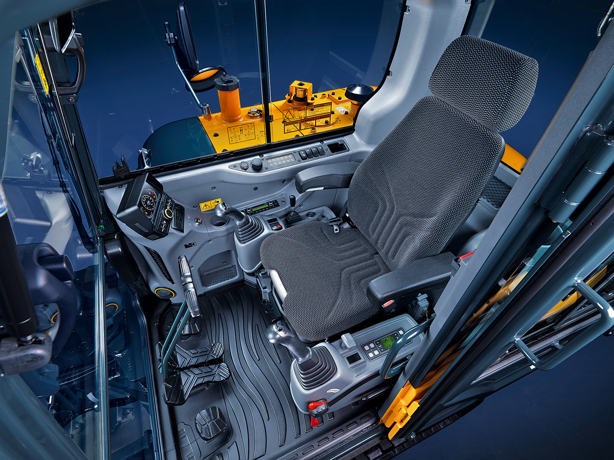 Das neue Kabinendesign bietet dem Fahrer mehr Platz, eine bessere Sicht, Rück- und Seitenkameras sowie einen voll einstellbaren und beheizbaren Fahrersitz. Weitere Komfortmerkmale sind eine überarbeitete Klimaanlage mit optimierter Luftzirkulation und ein gesenkter Geräuschpegel im Innen- und Außenbereich. Die Maschinen verfügen nun über einen 7-Zoll-Touchscreen-Monitor. Damit lassen sich die Zusatzhydraulikströme für Anbaugeräte einstellen.