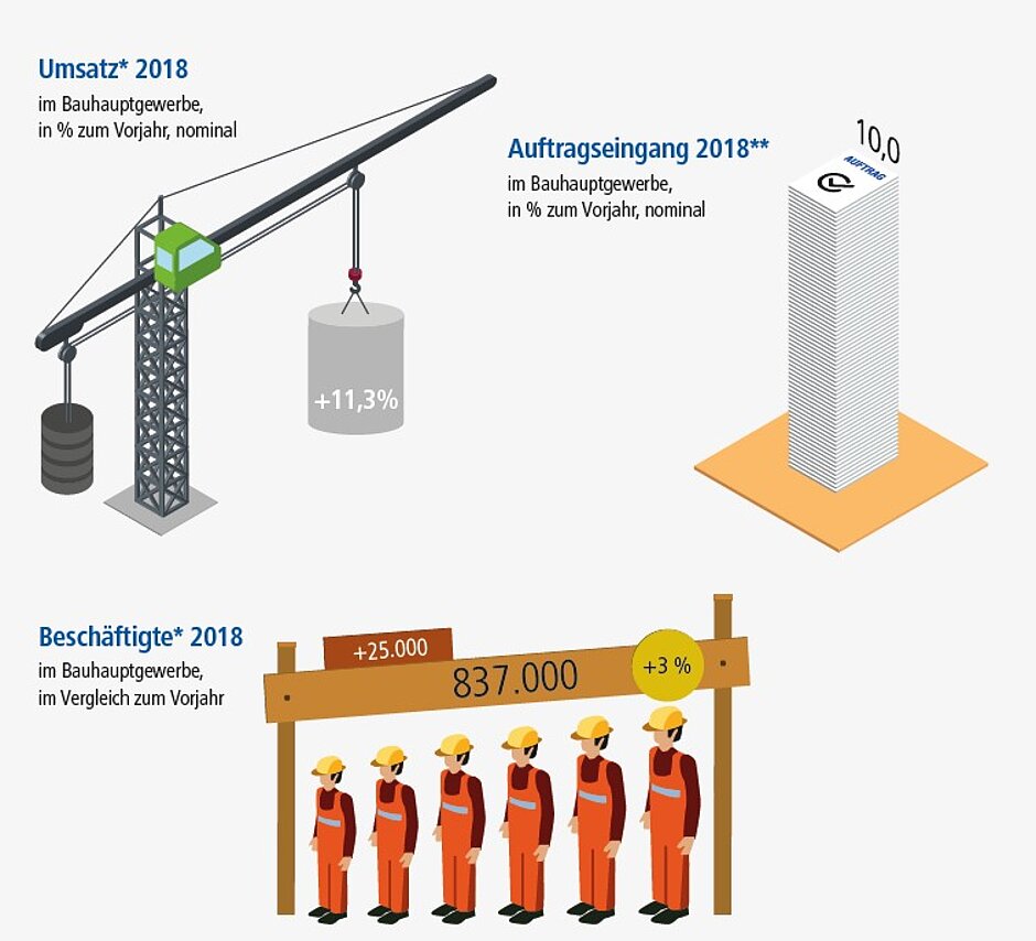 Auch für das laufende Jahr seien die Aussichten vielversprechend – immerhin habe, so Babiel, der Auftragseingang 2018 für Betriebe mit mehr als 20 Beschäftigten um 10 % zugelegt. Für Dezember haben die Baubetriebe (im Vergleich zum Vorjahresmonat) ein weiteres Plus von 10,2 % gemeldet – und das obwohl ihnen zwei Arbeitstage weniger zur Verfügung standen als im Dezember 2017.