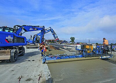 Wie wichtig es ist, ausreichend Mischkapazität und Material, dazu zählen Zement sowie Sande und Gesteinskörnungen, vorzuhalten, bestätigt auch Daniel Butterfaß, Werkleiter Godel Beton: »Damit keine Lieferengpässe entstehen, haben wir von vornherein für ausreichend Pufferspeicher beim Zement und bei den Gesteinskörnungen gesorgt. Gerade bei Großbetonagen geht es Schlag auf Schlag. Für vier Bodenplattenabschnitte wurden über 3 000 m³ Beton benötigt; dadurch mussten wir rund um die Uhr liefern«, berichtet Butterfaß.
