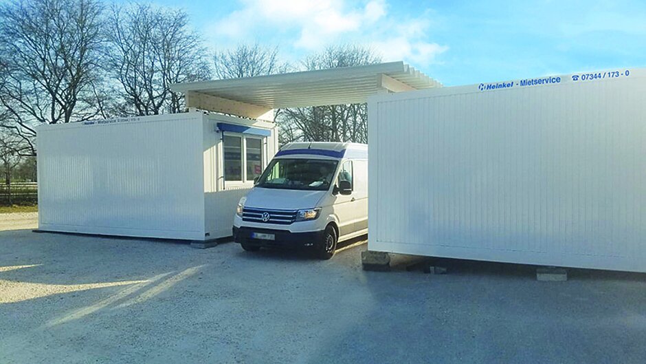 Auf Anfrage des Landratsamts Alb-Donau-Kreis stellte Heinkel Modulbau, Blaubeuren jeweils drei Container für jeden Standort zur Verfügung. Zwei davon dienen zur Untersuchung, einer wird jeweils als Sanitärcontainer für das Personal genutzt. Der Mietvertrag läuft vorerst bis Ende Juni. Innerhalb von nur fünf Tagen waren die Container nutzungsbereit.