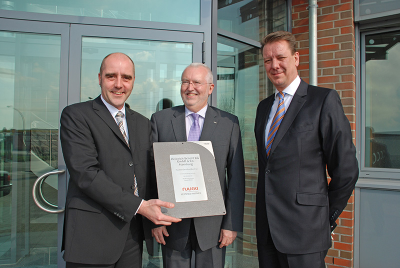 Die Heinrich Schütt KG GmbH & Co. ist Ruukkis erster Zertifikatspartner in Deutschland. Das Unternehmen bietet ein breites Angebot an Stahlprodukten und führt unter anderem Ruukki-Laser sowie Optim- und Raex-Bänder und -Bleche. Ruukki arbeitet seit über 25 Jahren mit Schütt zusammen. »Die intensive Zusammenarbeit mit Ruukki hat sich für uns enorm bezahlt gemacht. Gerade die technische Ausbildung unserer Mitarbeiter durch Ruukki ist für uns von großem Nutzen«, sagt Schütt-Geschäftsführer Thomas Naydowski. Ruukkis Zertifikatspartner-Programm umfasst weltweit ausgewählte Unternehmen, die sich auf den Vertrieb von Spezialstählen konzentrieren. Das Programm soll sowohl Ruukki als auch den Geschäftspartnern zahlreiche Vorteile bieten: Ruukki stellt technischen Support sowie Serviceleistungen zur Verfügung und realisiert Marketingkooperationen. Im Gegenzug erhält der Stahlproduzent tiefe Einblicke in die Kundenbedürfnisse.