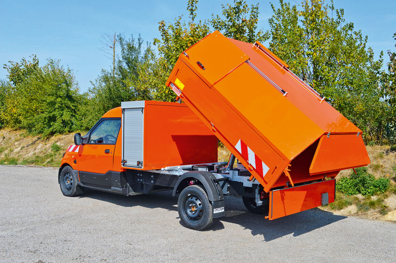 Trotz der Leichtbauweise müssen die Fahrzeuge robust und langlebig aufgebaut sein. Das Anforderungsprofil der Kommunen ist hoch und die Aufbaulösungen müssen speziell angepasst werden können. Der neue Alu-Kipper-Aufbau von Schutz will eine perfekte Grundlage bieten. Er kann in drei Richtungen kippen, wird elektrohydraulisch betätigt und über eine Kabelfernbedienung gesteuert.