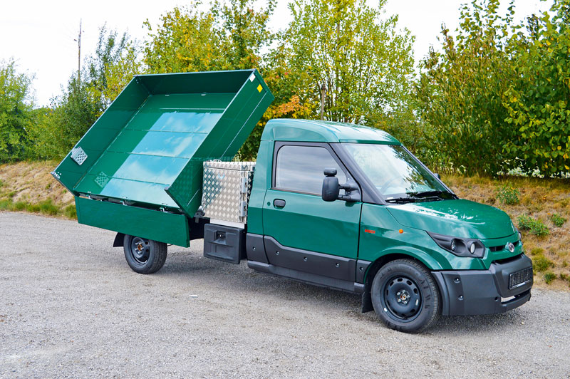 In Stadtgebieten und überall dort, wo lautlos und emissionsfrei gearbeitet werden soll, bietet sich der Einsatz dieser Fahrzeuge an. Der neue Alu-Kipper-Aufbau DKA von Schutz zeichnet sich durch einen robusten, feuerverzinkten Unterrahmen und Querausleger mit Kippkugellager aus. Mit großem Materialkasten aus GFK plus zwei Aluminium-Rollos zeigt sich der Work L gut für den Kommunalbereich geeignet. Der Materialkasten ist mit einer Mitteltrennwand, zwei Böden und einer Durchlademöglichkeit für Besen und Schaufeln ausgerüstet. Die Abmaße des Materialkastens betragen 1 800 mm x 600 mm x 1 100 mm (L x B x H) bei einem Eigengewicht von circa 85 kg.